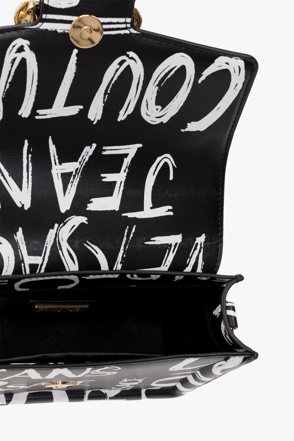 Black shoulder bag from Versace Jeans Couture. Crafted from faux leather, this design fastens with a zip and showcases a logo pattern. It is complete with the brand\'s signature gold-tone baroque buckle on the front, a detachable chain strap, an adjustable shoulder strap, gold-tone metal hardware and one internal compartment with a slip pocket.