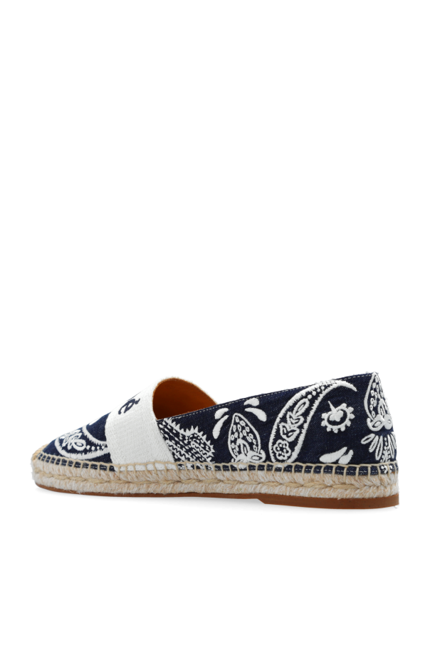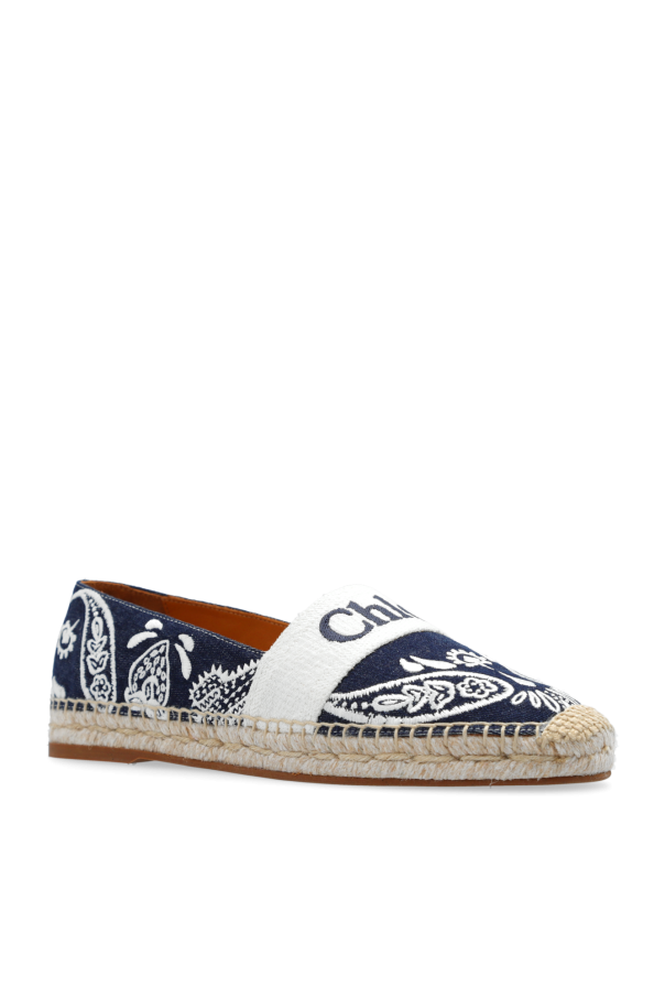 Introducing the \'Piia\' Espadrilles by Chloé, a quintessence of refined summer footwear. These espadrilles exude an understated elegance, featuring a dominant navy hue, beautifully contrasted with white decorative elements and a classic, beige jute sole. The symmetrical white pattern, reminiscent of ethnic embroidery, adorns the navy canvas, creating a visually captivating appeal. The shoes boast a classic, flat silhouette with a rounded front, crafted from premium textile, likely cotton, ensuring both comfort and durability. The sole, a hallmark of traditional espadrilles, is meticulously woven from jute, offering a touch of rustic charm. Notably, the designer\'s signature is gracefully inscribed on the front panel, a testament to Chloé\'s attention to detail and craftsmanship. With a no-fuss slip-on design and an interior possibly lined with leather, these espadrilles promise an exceptional wear experience. Why Purchase the \'Piia\' Espadrilles? Elegance & Comfort: Combines timeless design with the comfort of high-quality materials. Exquisite Craftsmanship: Showcases Chloé\'s meticulous attention to detail and dedication to quality. Unique Design: The ethnic-inspired pattern and designer inscription elevate the classic espadrille to a piece of wearable art. Versatile Wear: Perfect for both casual outings and sophisticated summer gatherings.