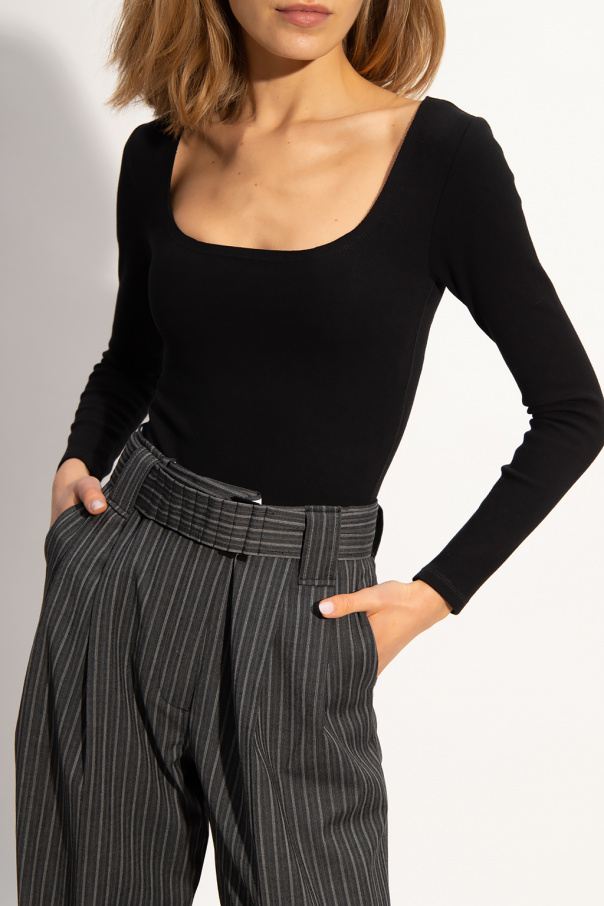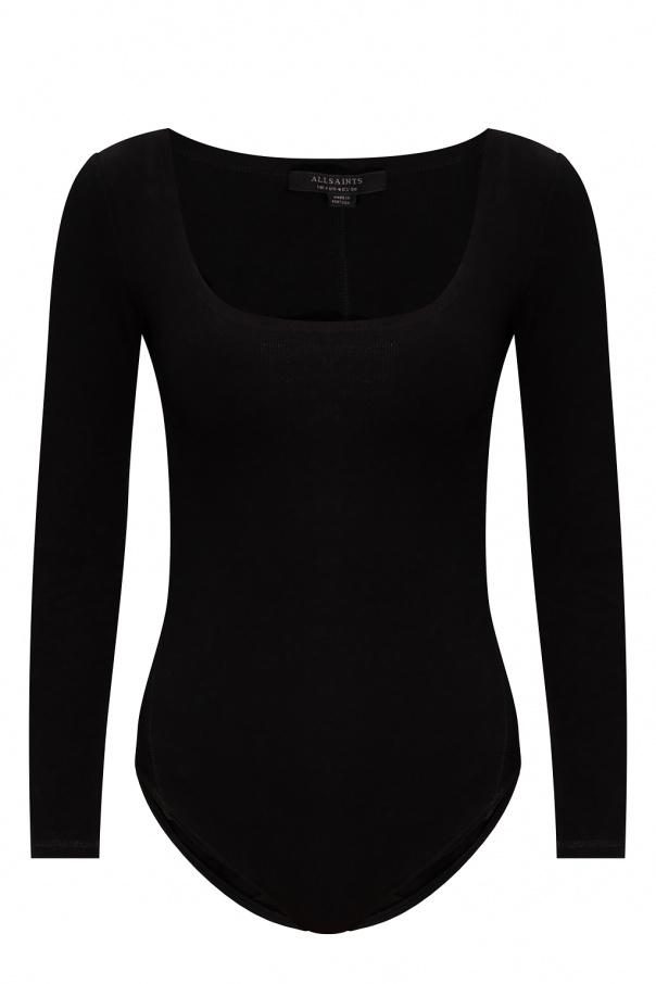 Black \'Jamie\' bodysuit from AllSaints. Made from a stretch cotton blend with ribbed detailing, this style features snap fastenings and long sleeves.