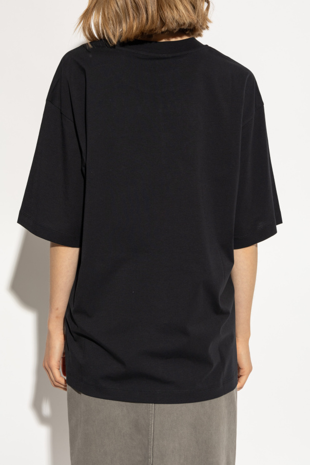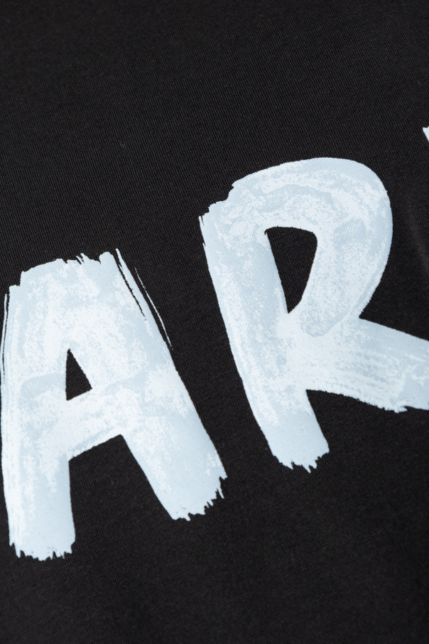Introducing the epitome of sophisticated casual wear, the Marni Long Sleeve Logo T-shirt. Crafted with meticulous attention to detail, this garment is a testament to the luxury and avant-garde spirit of the Marni collection. Its understated silhouette, accentuated by comfortably loose sleeves, seamlessly blends casual flair with an elegant aesthetic. The dominant black hue of this T-shirt ensures its versatility and ease of integration into any wardrobe, making it a quintessential staple for discerning fashion enthusiasts. The front of the shirt is adorned with a large, white distressed logo that reads \"MARNI.\" This deliberately aged print not only identifies the prestigious brand but also adds a layer of exclusivity and originality to the piece. Made from premium-quality cotton or a cotton blend, this T-shirt promises unparalleled comfort and durability. The fabric\'s high caliber is typical of exclusive apparel brands, offering a luxurious feel against the skin. A closer inspection of the print reveals a high level of craftsmanship, highlighting the product\'s exquisite finish. Why Purchase This Product? Exclusive Design: Stand out with the distinctive, aged Marni logo that adds a touch of elegance. High-Quality Material: Enjoy the luxurious comfort of premium cotton or cotton blend fabric. Versatile Style: The T-shirt’s timeless black color and simple cut make it ideal for a myriad of occasions and pairings. Brand Prestige: Owning a piece from the renowned Marni collection signifies a taste for high-end, avant-garde fashion.