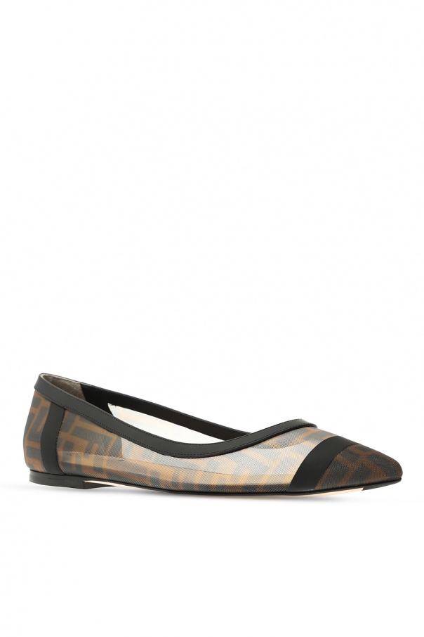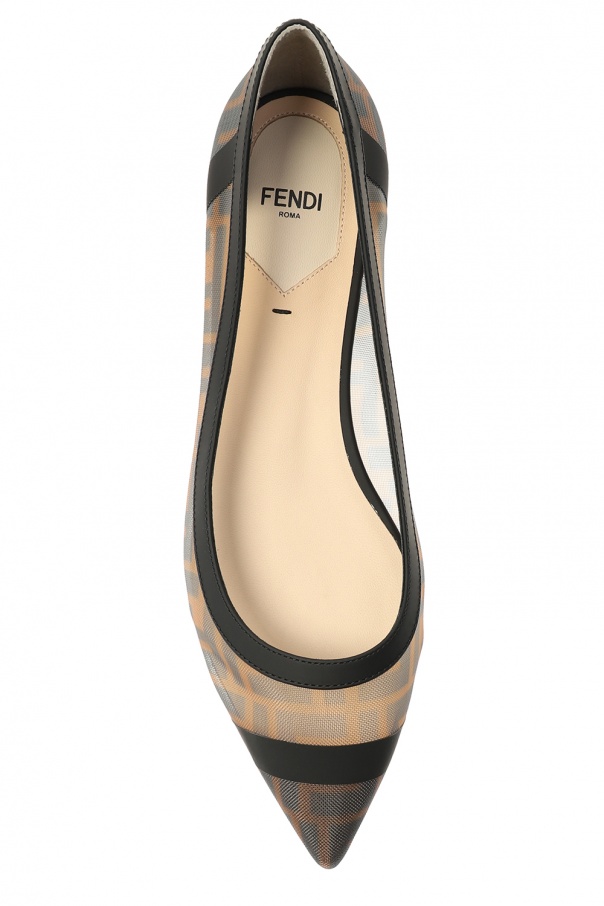 Black and brown, sheer ballet flats from Fendi. Made of leather. Decorated with a logo pattern. Pointed toe. Beige and black leather sole. Trimmed with leather.