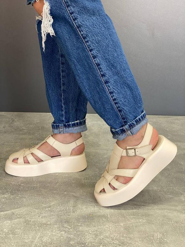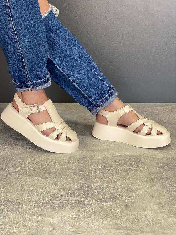 Жіночі закриті босоніжки бежевого кольору з натуральної шкіри на платформі.