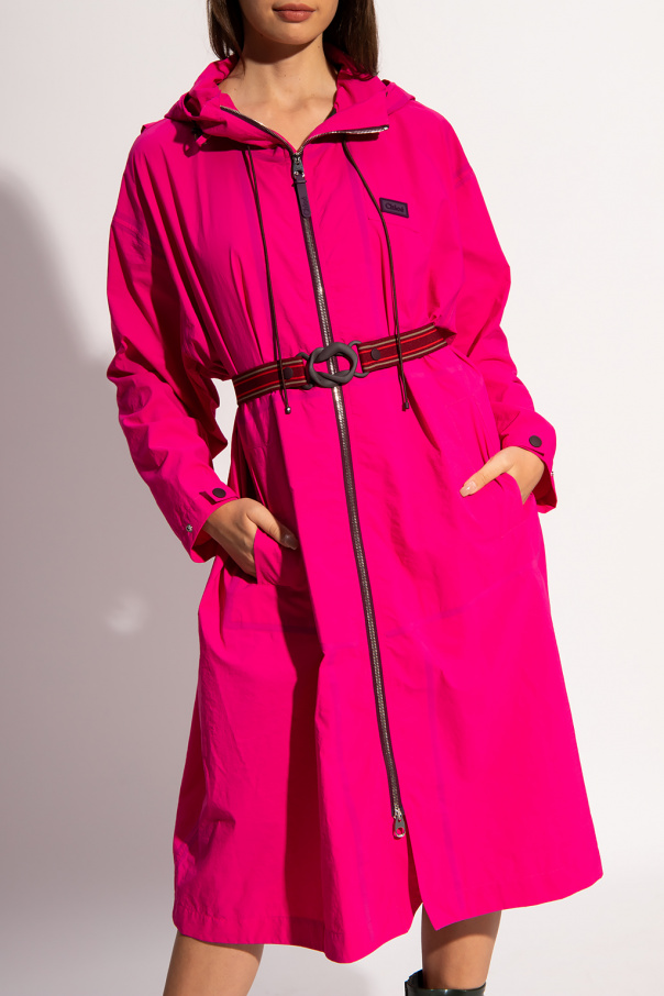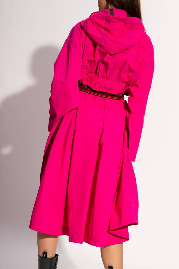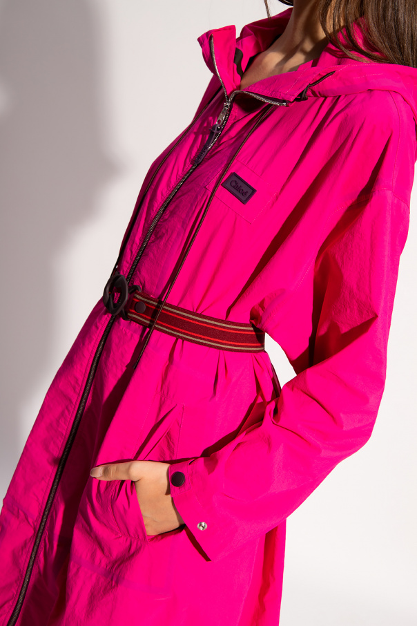 Pink and maroon rain coat from Chloé. Fastened with a two-way zip, this oversize design features a buckle belt, drawstring hood, two front pockets, rubber logo appliqué and a logo printed at the back.