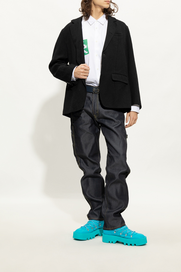 Blue snow boots from JW Anderson. Sitting on a blue rubber sole, this lace-up model features an additional velcro closure, silver-tone metal hardware and a white logo print at the back.