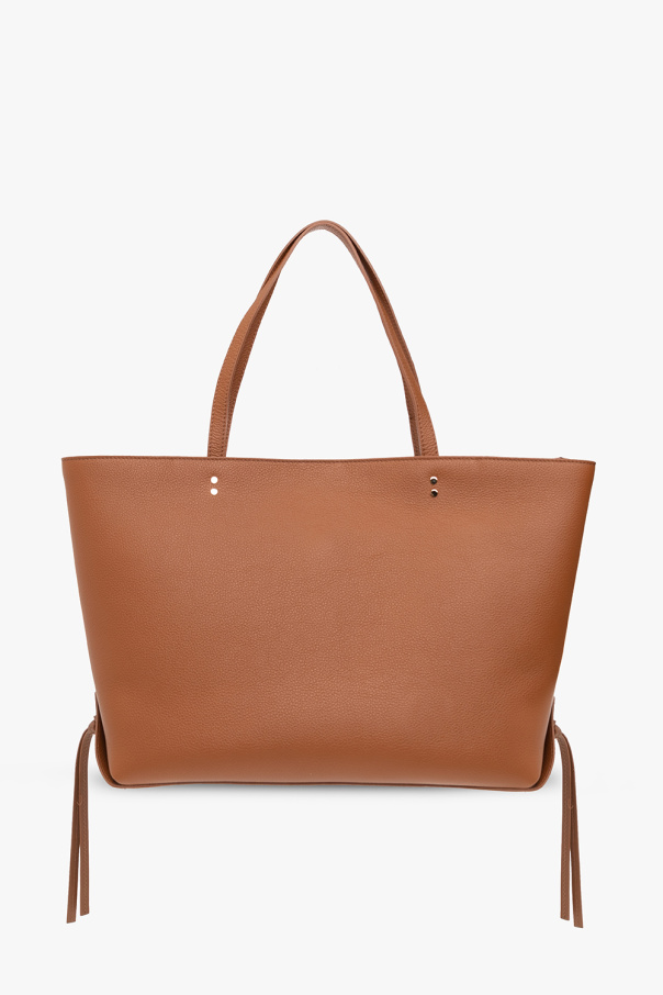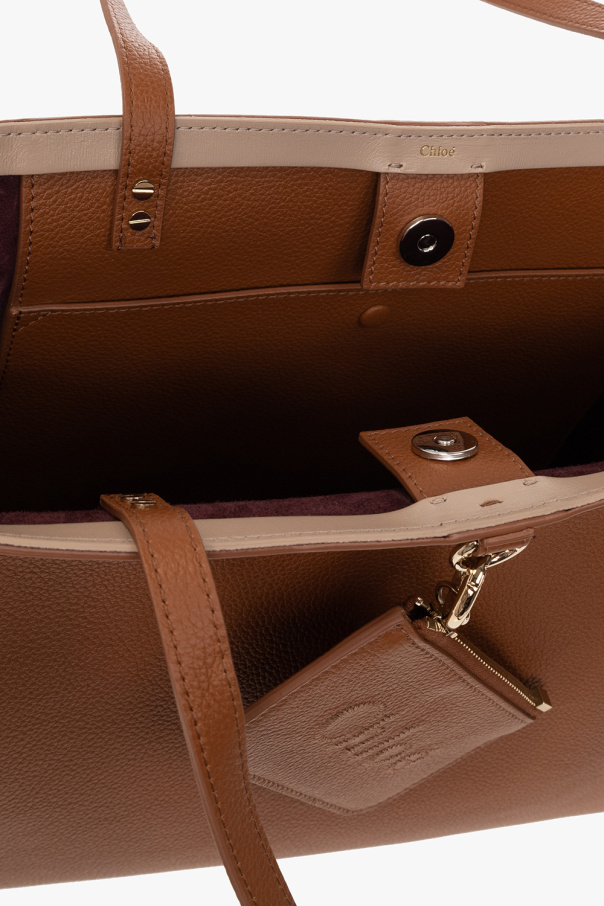 Brown ‘Chloé Sense Medium’ shopper bag from Chloé. Made of calf leather, this model fastens with snaps and is complete with tassels on the sides, two half-round handles, detachable and adjustable shoulder strap, light gold-tone metal hardware and one internal compartment with a snap-fastened pocket. Comes with a detachable zipped pouch and logo embroidery.