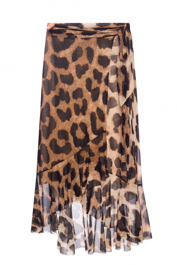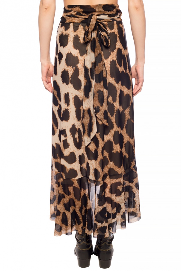 Black, brown and cream skirt from Ganni. Tie fastening at the waist. Decorated with a printed pattern and decorative ruffles.