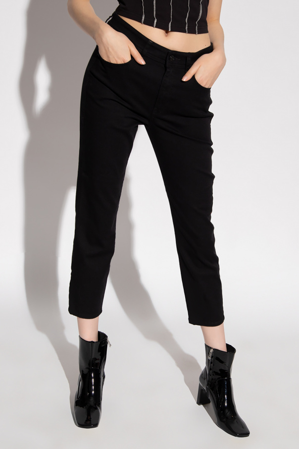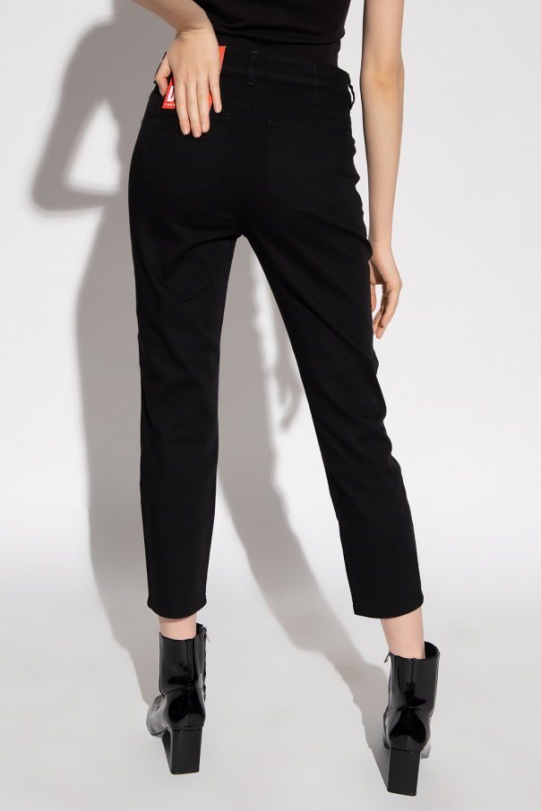 Black ‘2004’ jeans from Diesel. Falling with tapered legs, this pair features a zip fly with a button, classic five pockets, a logo patch on the front and black monogram embroidery on the back.