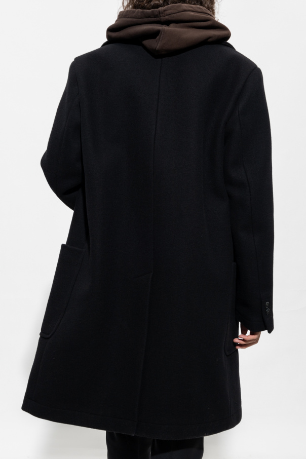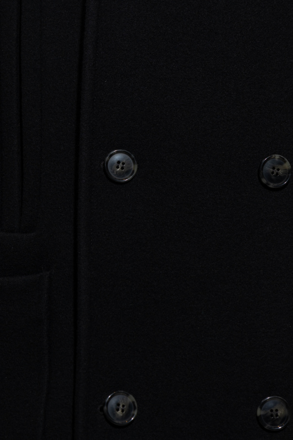 Black coat from MM6 Maison Margiela. Crafted from wool with a double-breasted, oversize silhouette, this style features button fastenings, a collar with notch lapels, four slip pockets, a single back vent and long sleeves with button cuffs.