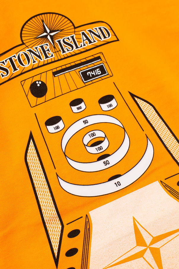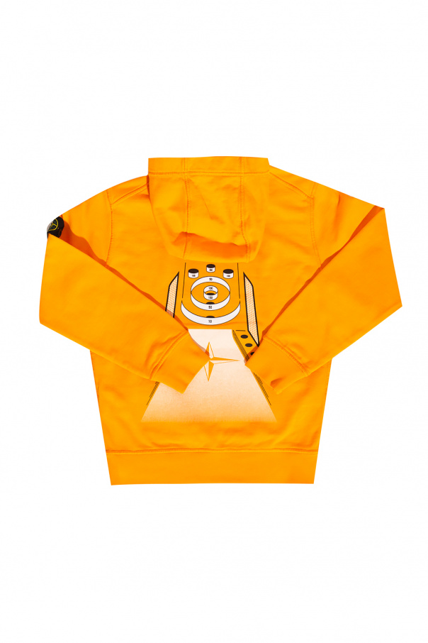Orange sweatshirt with a drawcord-adjustable hood from Stone Island Kids. Crafted from cotton jersey, this hoodie showcases a black and white graphic print with the brand\'s logo, a kangaroo pocket and a ribbed bottom hem and cuffs.