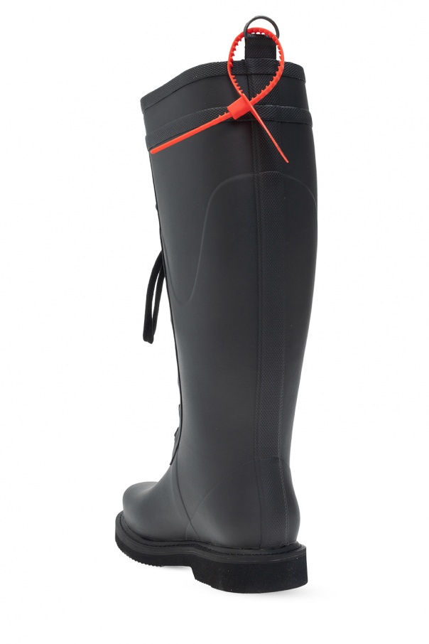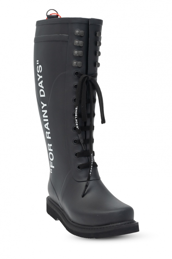 Black ‘Rain’ boots from Off-White. Set on a black rubber sole, this lace-up model features printed lettering in white.