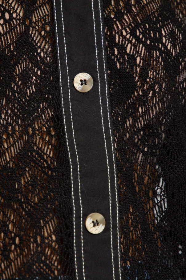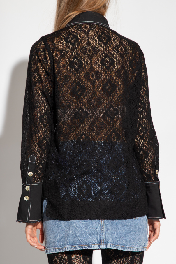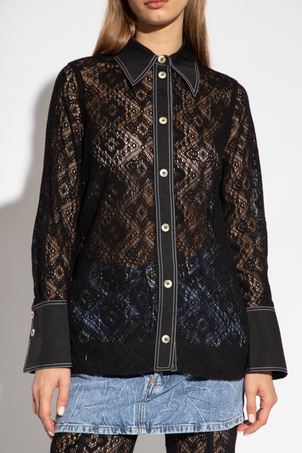Black lace shirt from Ganni. Crafted from a blend of recycled materials and cotton, this design features button fastenings and long sleeves with buttoned cuffs.