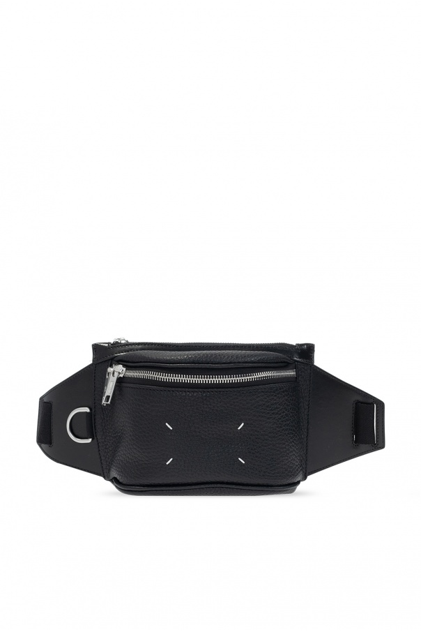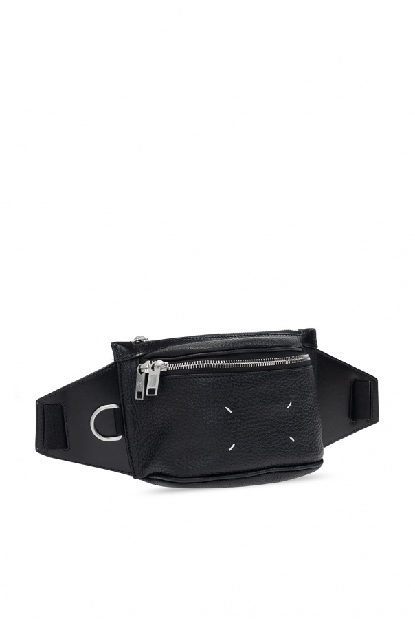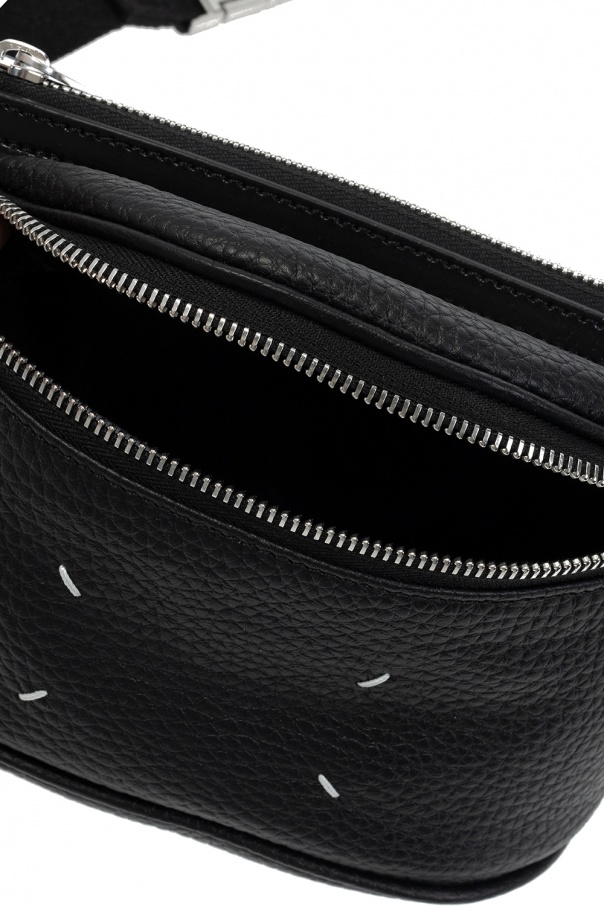 Black belt bag from Maison Margiela. Defined with white embroidered detail with logo, this design secures with two-way zipper and employs an adjustable strap, an external zip pocket on the back, silver-tone metal hardware and interior with one compartment and one zipped pocket.
