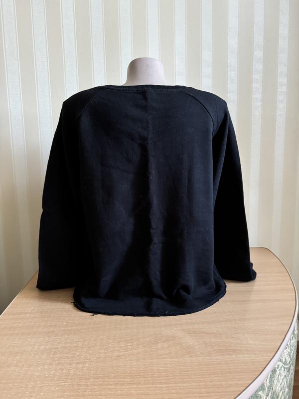 Стильный спереди укороченный свитшот с рисунком спереди, рукавом реглан и рельефной резиной по низу рукава.