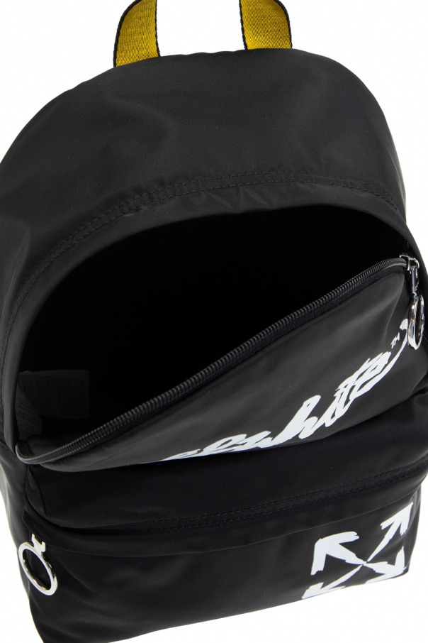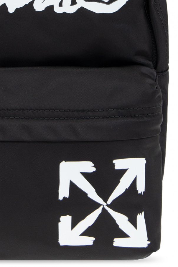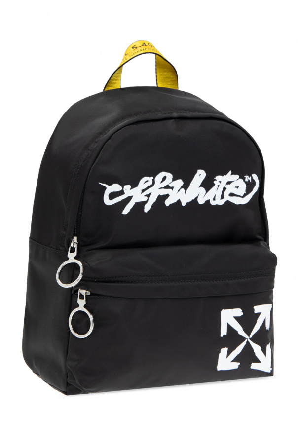 Black backpack from Off-White Kids. Embellished with a printed white logo motif, this design fastens via a zip and features a zip pocket on the front, a half-round top handle, adjustable shoulder straps, silver-tone metal hardware and one internal compartment.