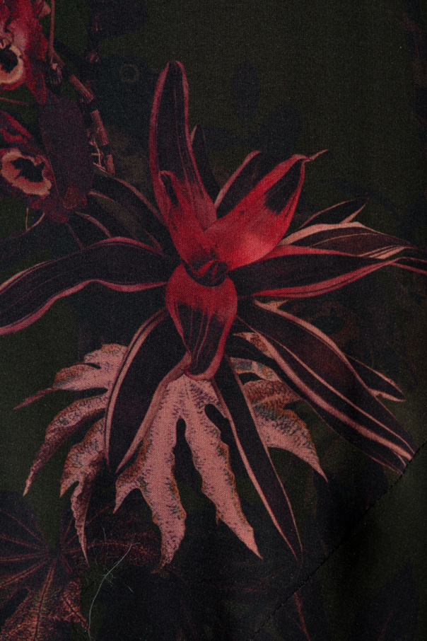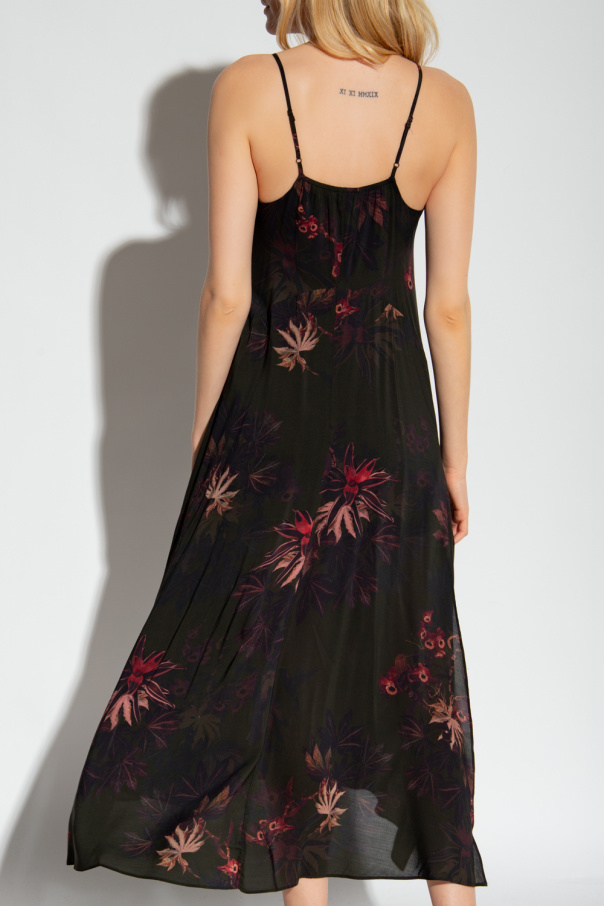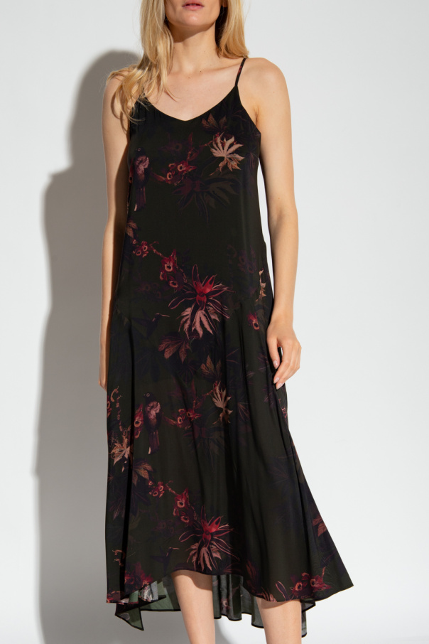 Dark green ‘Essey’ dress from AllSaints. Embellished with a colourful floral pattern, this style features side slits and adjustable shoulder straps.