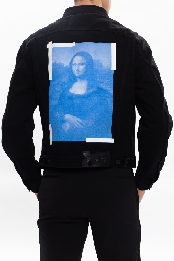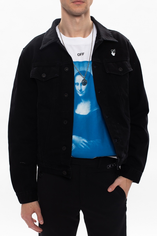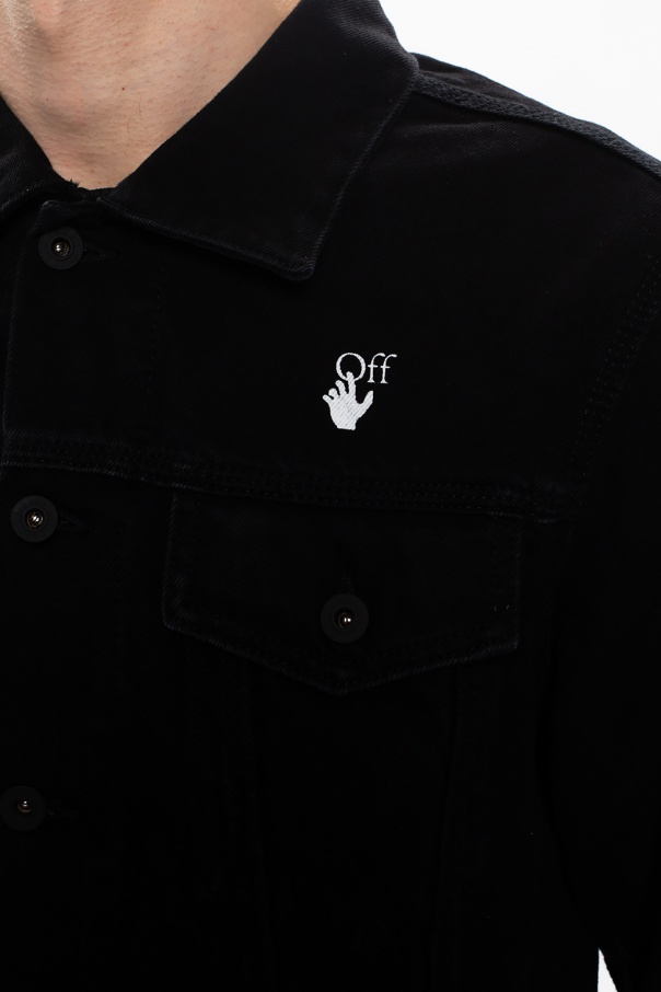Black denim jacket from Off-White. Fastened with buttons, this long sleeve design features a printed logo pattern in white, two slip pockets and two buttoned flap pockets.