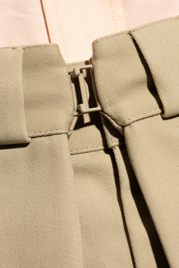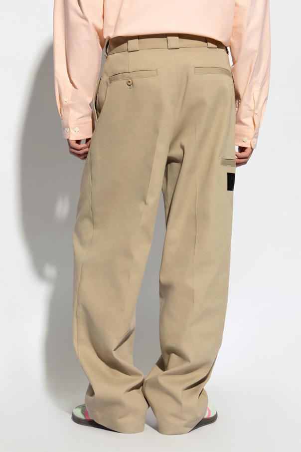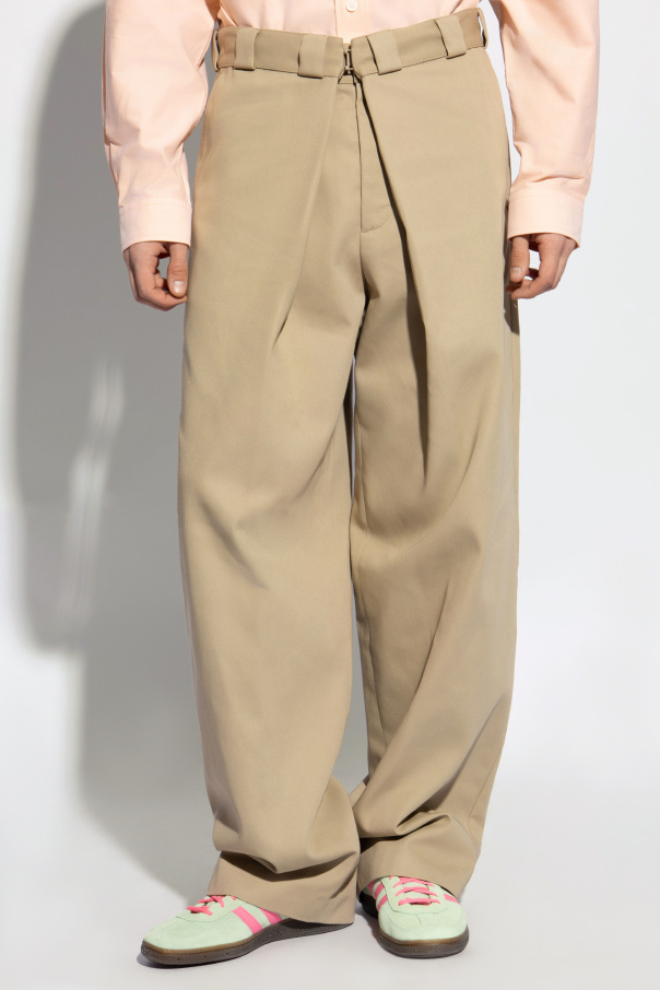 Introducing the pinnacle of sartorial elegance: the Givenchy Pleated Trousers. Rendered in a sublime beige hue, these trousers exude a timeless charm, seamlessly blending classic design with contemporary flair. Crafted with an eye for detail, the trousers boast a sleek, straight-leg silhouette with wide legs, ensuring a flattering fit for any physique. The absence of patterns accentuates the smooth texture of the fabric, which suggests a fine blend of woolen and synthetic fibers, offering both comfort and durability. The front pleats add volume and a touch of sophistication, making these trousers a statement piece in any wardrobe. Additionally, the inclusion of an adjustable belt with a buckle closure and buttons allows for a customizable fit, while the simple back pockets offer practicality without compromising style. Though the fabric\'s exact composition remains a mystery, its quality is undeniable, promising to be a staple in your collection. The trousers also feature a discreet zipper fly with a hook-and-loop fastening, ensuring a secure and seamless closure. Why Purchase These Trousers? Elegance Redefined: The classic cut and exquisite beige color offer unmatched sophistication. Attention to Detail: From the pleats to the adjustable belt, every aspect is designed with precision. Versatility: Perfect for formal and casual occasions alike, these trousers are a versatile addition to any wardrobe. Heritage of Quality: Givenchy\'s reputation for luxury and quality guarantees a product that stands the test of time.
