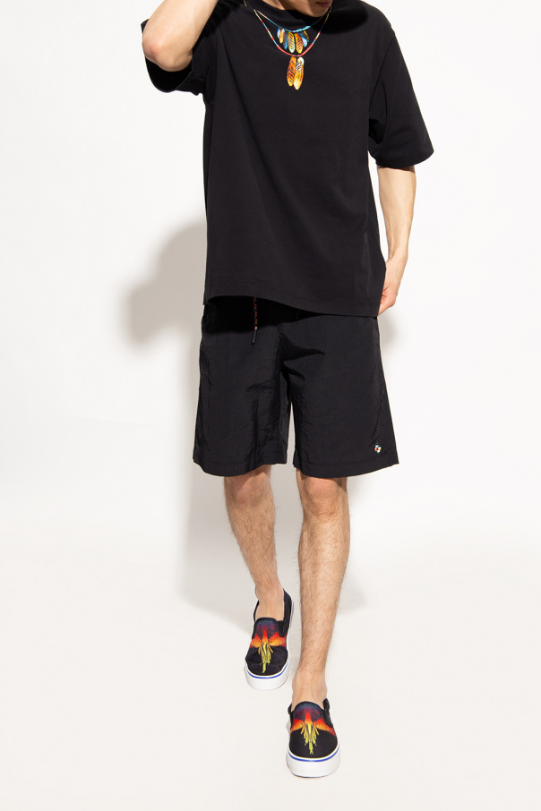 Black slip-on sneakers from Marcelo Burlon. Made of cotton with leather trims, this slip-on pair features a multicolored print with the label’s signature feather motif, elastic side panels, leather strap with a white logo at the back and rubber sole with a raised logo in white and blue.