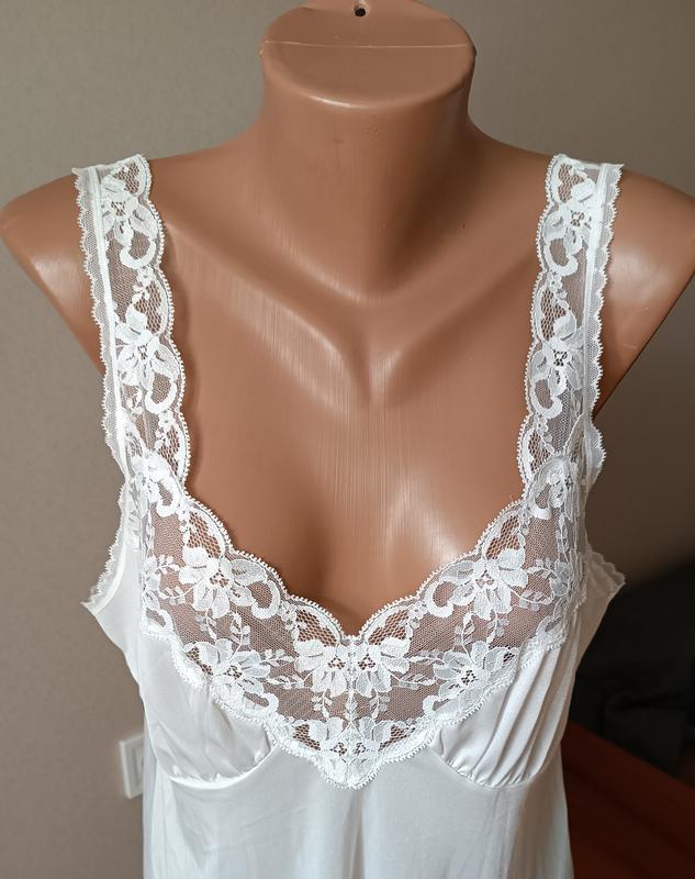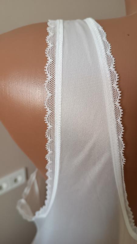 Базовая белая, нейлоновая, женская комбинация от английского бренда St. Michael, на широких бретельках, декорирована кружевом.