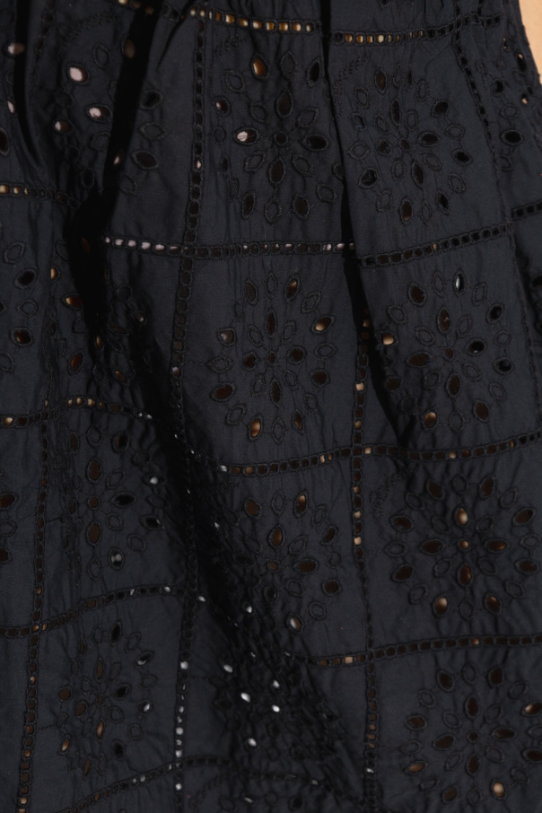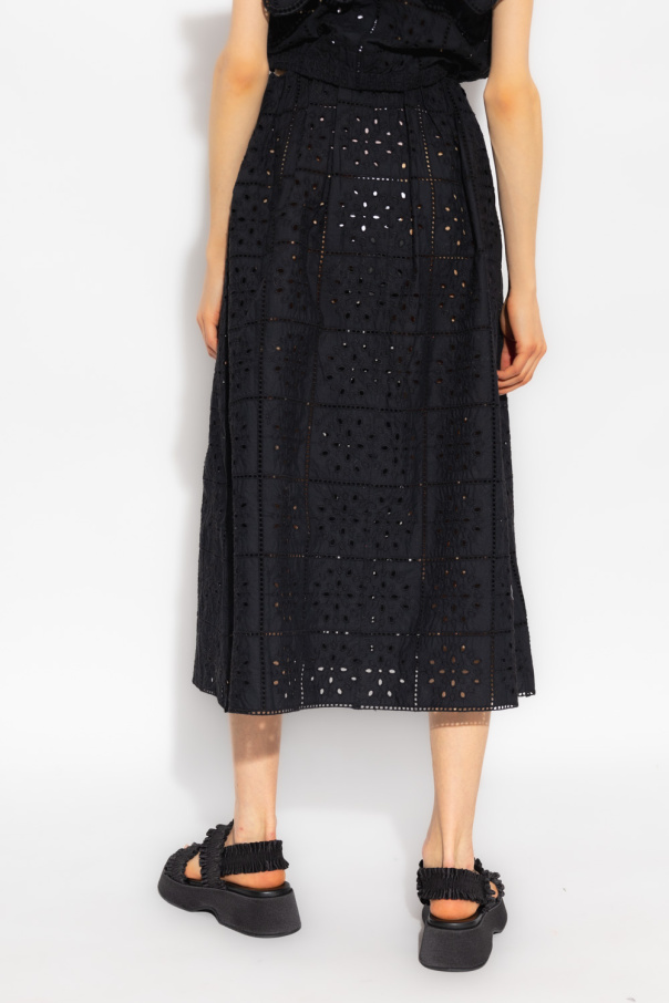 Black skirt from Ganni. Crafted from organic cotton, this style features an elasticated waistband and openwork detailing with embroidery.