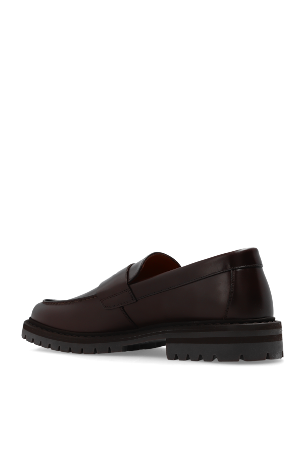 Dark brown loafers from Common Projects. Made of smooth leather, this slip-on pair features a gold-tone series print and rubber sole in brown and grey.