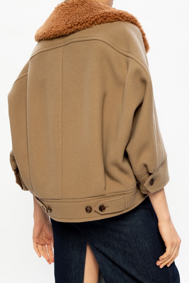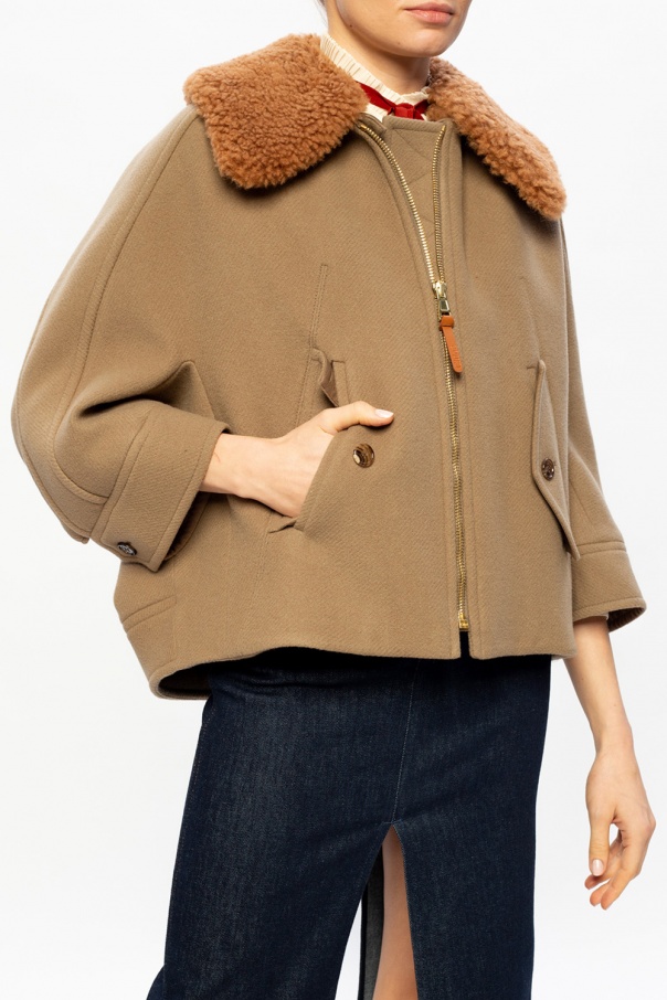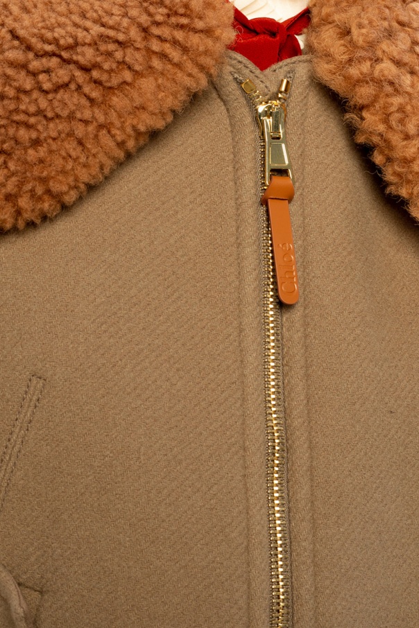 Brown coat with a collar from Chloé. Crafted from wool, this design features brown fur trims, zip fastening and two buttoned flap pockets on the front.