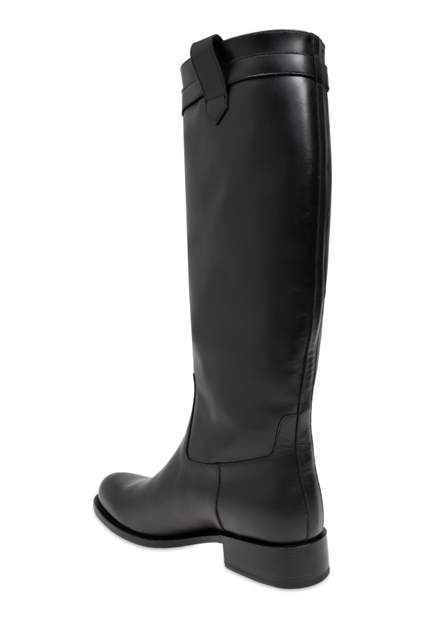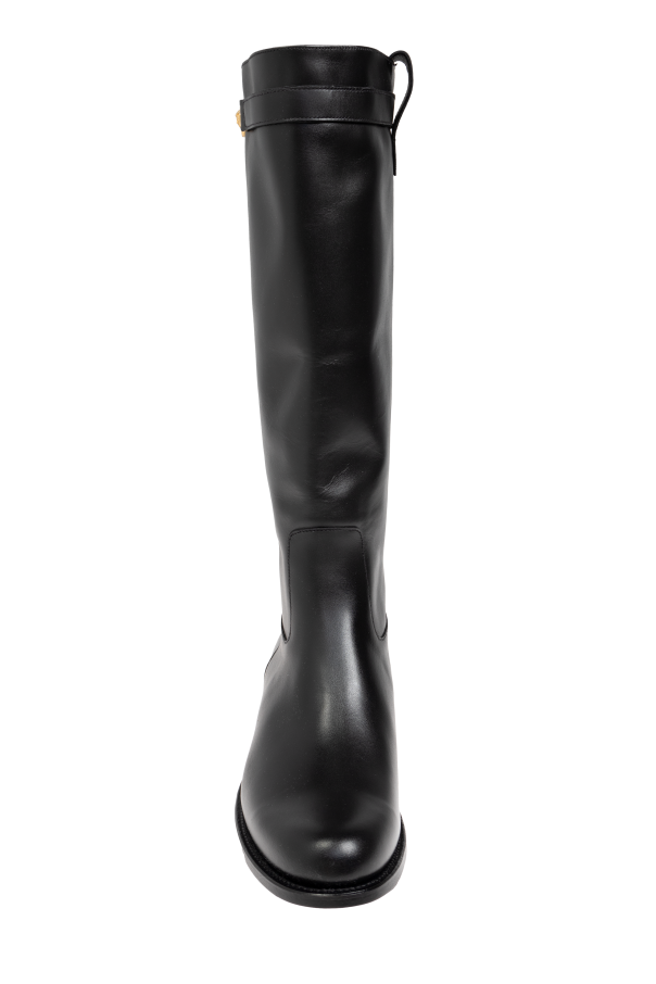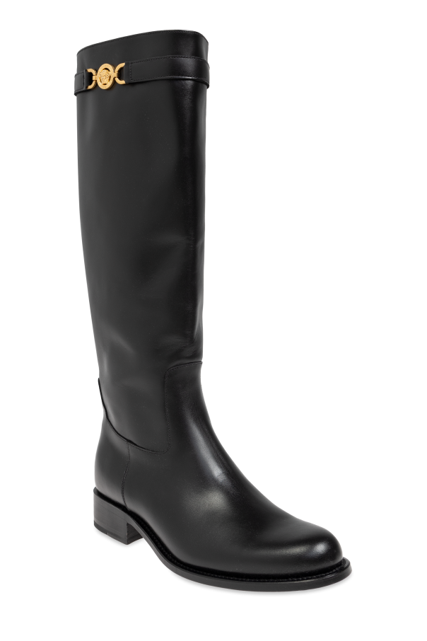 Introducing the Medusa \'95 boots by Versace, a paragon of timeless elegance and sophisticated craftsmanship. These knee-high boots, meticulously crafted from premium smooth leather, epitomize luxury in every detail. The Medusa \'95 boasts a sleek, classic silhouette with a subtle rounded toe, exuding understated refinement. Their dominant deep black hue further enhances their versatile allure, making them an indispensable addition to any discerning wardrobe. The boots feature a distinctive gold embellishment adorned with the iconic Medusa logo at the top of the shaft, a symbol of Versace\'s opulent heritage. With a low, flat heel, these boots promise comfort for everyday wear without compromising on style. Designed for both fashion and function, the Medusa \'95 boots are slip-on, eliminating the need for visible zippers or laces, and ensuring a seamless, polished appearance. The interior is lined with high-quality materials, providing unparalleled comfort throughout the day. Why Choose This Product? Exquisite smooth leather construction for a luxurious finish. Elegant knee-high design, perfect for colder days. Subtle yet distinctive gold Medusa logo for a touch of sophistication. Comfortable low heel suitable for all-day wear. Practical slip-on design for ease and convenience.