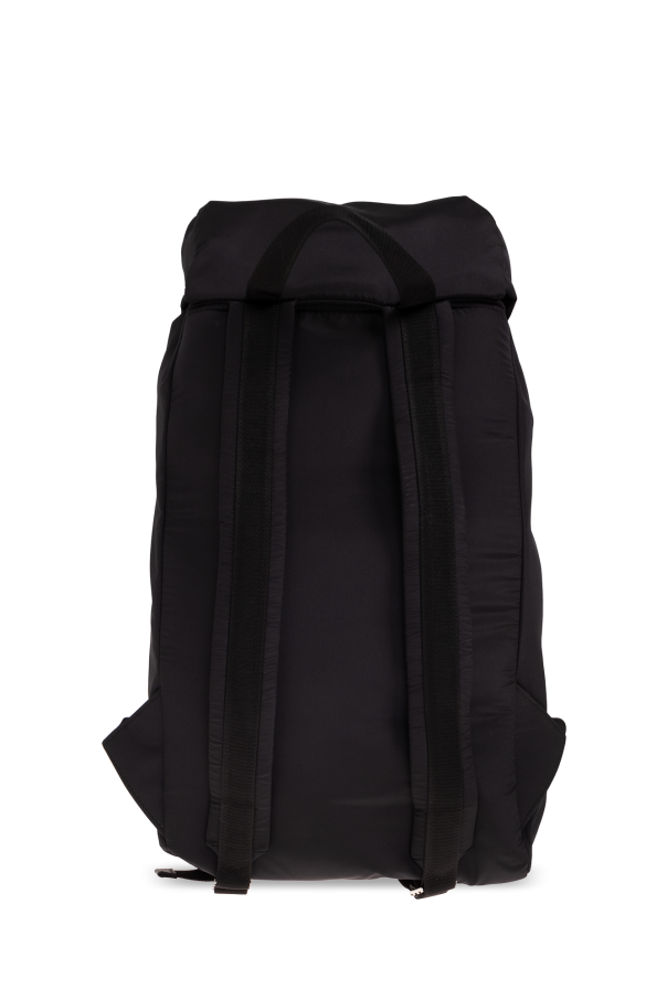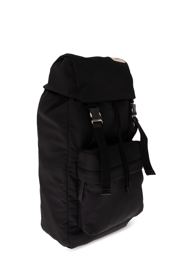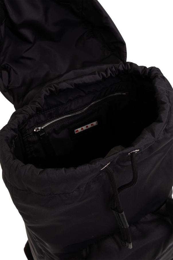 Black ‘Zaino’ backpack from Marni. This model features a flap with adjustable snap-fastened snaps, logo patch, zipped front pocket, half-round handle, adjustable shoulder straps, silver-tone and black metal hardware as well as one internal compartment with drawstrings and one zip pocket.