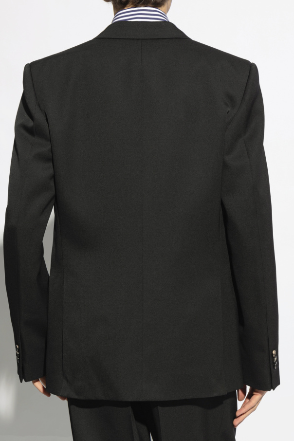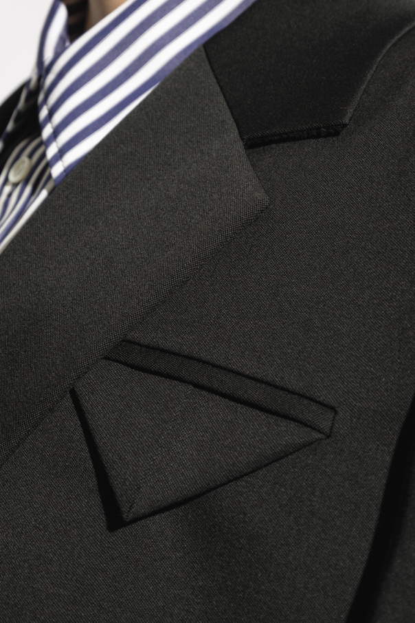 Introducing an exquisite piece from the Bottega Veneta exclusive clothing collection, this Black Open-Lapel Blazer is the epitome of modern sophistication and casual elegance. Crafted with meticulous attention to detail, the blazer is fashioned from 100% wool, ensuring a smooth texture and high-quality finish. The interior is lined with 100% viscose, offering a luxurious feel against the skin. The blazer features open lapels that lend a contemporary and relaxed air, making it a perfect choice for both formal and semi-formal occasions. A single-button closure adds a touch of casual flair, while the classic side flap pockets and a single chest pocket offer functionality without compromising style. The sleeves are adorned with four buttons, a nod to traditional tailoring. The blazer\'s standard, straight cut is designed to flatter the male silhouette, highlighting its universal appeal and elegance. Unique contrasting stitching on the pocket lapel adds an individualistic character, setting this piece apart. Notably absent of any overt branding, this Bottega Veneta blazer speaks volumes through its subtlety and refined aesthetic. Its black color and premium fabric selection mark it as an essential component of any discerning gentleman\'s wardrobe. Why Purchase This Product? Expertly crafted from 100% wool with a 100% viscose lining for unparalleled quality and comfort. Modern open lapel design and single-button closure merge classic tailoring with contemporary style. Functional pockets and classic four-button sleeve detailing combine elegance with practicality. Unique contrasting stitching adds a distinctive touch to this versatile and elegant black blazer. Subtle branding and meticulous attention to detail reflect Bottega Veneta\'s commitment to luxury and understated elegance.