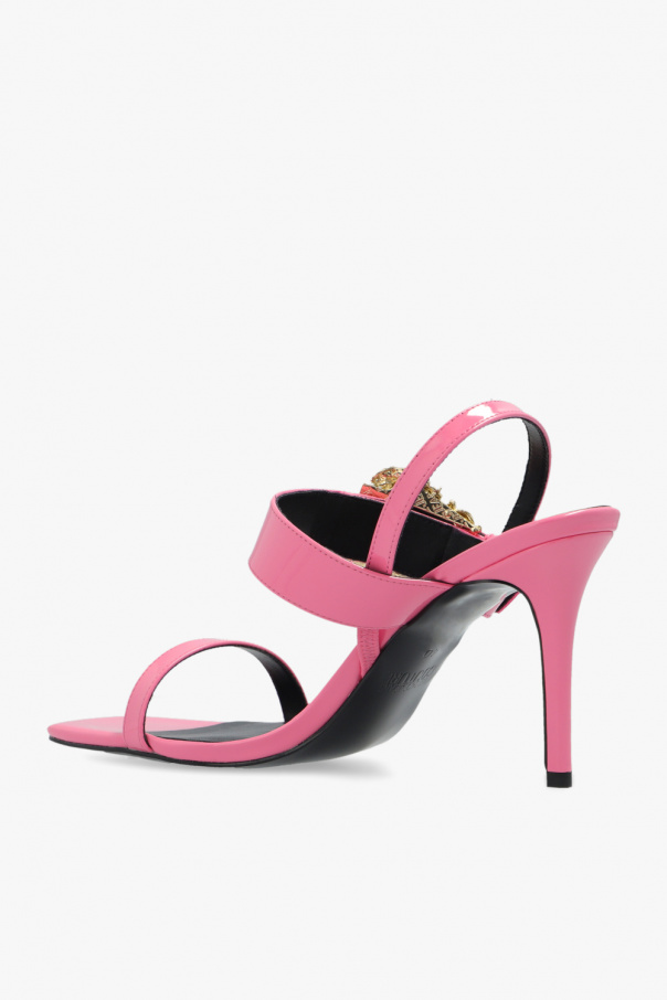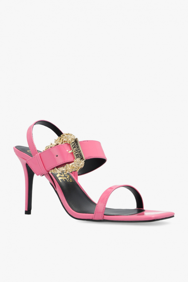 Pink heeled sandals from Versace Jeans Couture. Crafted from faux patent leather, this pair is complete with an adjustable strap with a decorative Baroque pattern and logo buckle in gold-tone, square toe and black rubber sole.