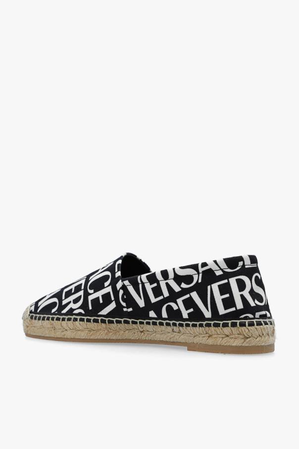 White and black espadrilles from Versace. Made of fabric, this item features a logo pattern and beige rubber sole.