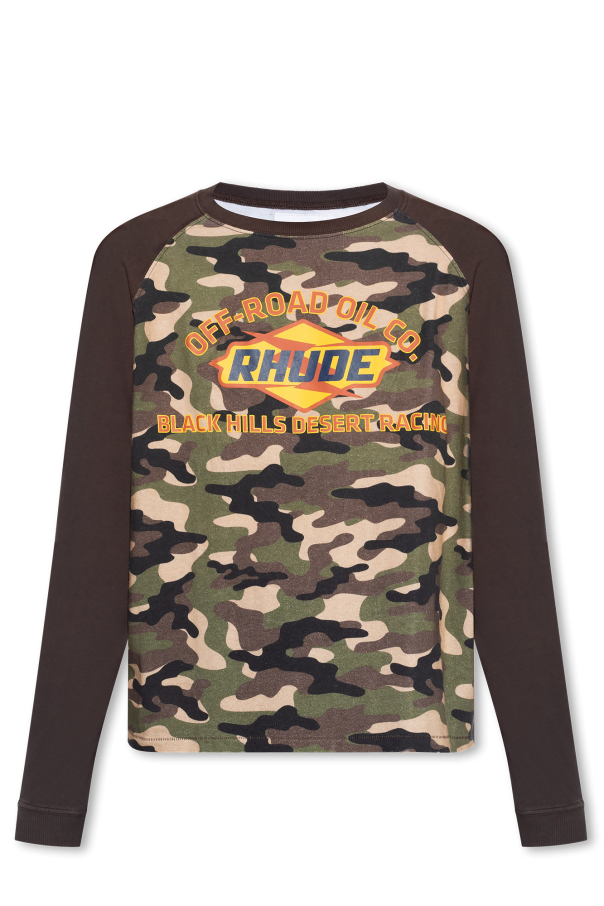 Multicolored T-shirt from Rhude. Crafted from cotton with a washed effect, this long sleeve design features a camo pattern, logo print and ribbed trims at the crew neck and cuffs.