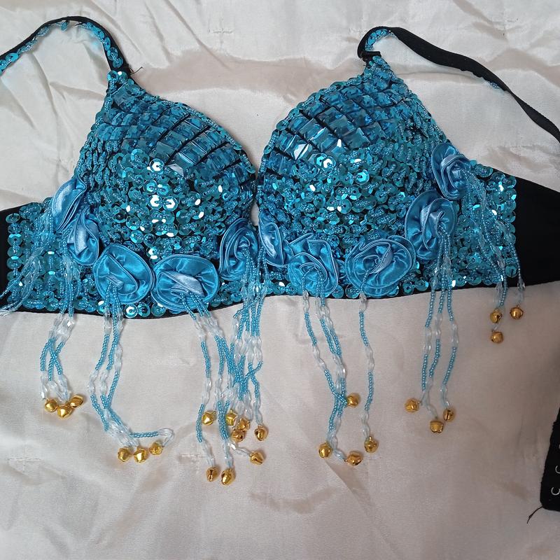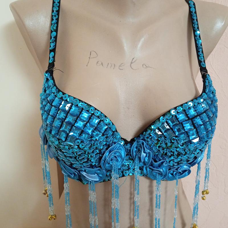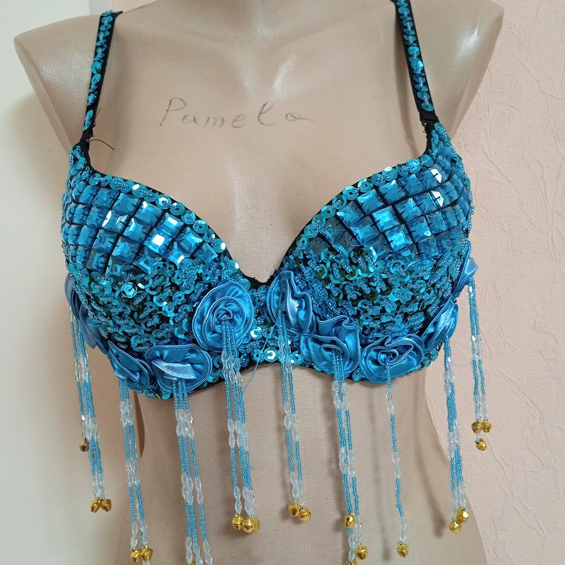 Бюст,очень красивый, яркий, украшенный бисером,стразами,пайетками и розами из атласной ленты.Объем под грудью 70 см( минимум).Размер лифчика не указано, а примерно 2, с пущ апом.Есть нюанс: не хватает несколько нитей бусенок.