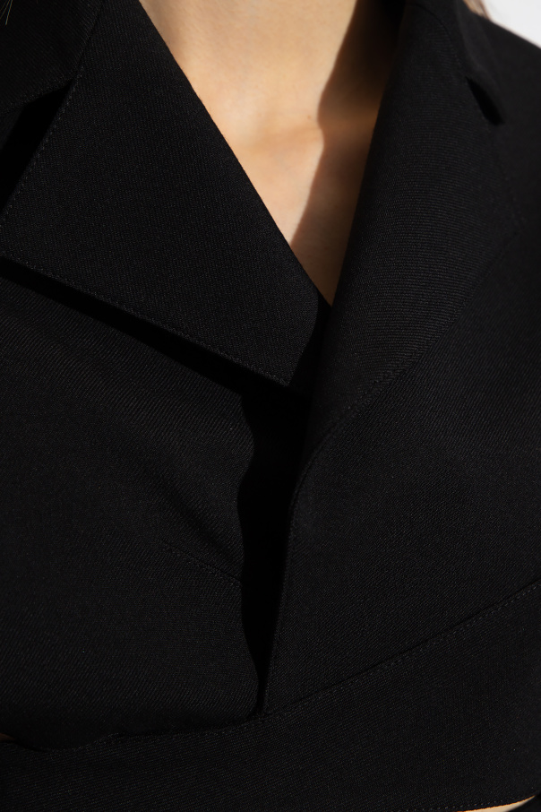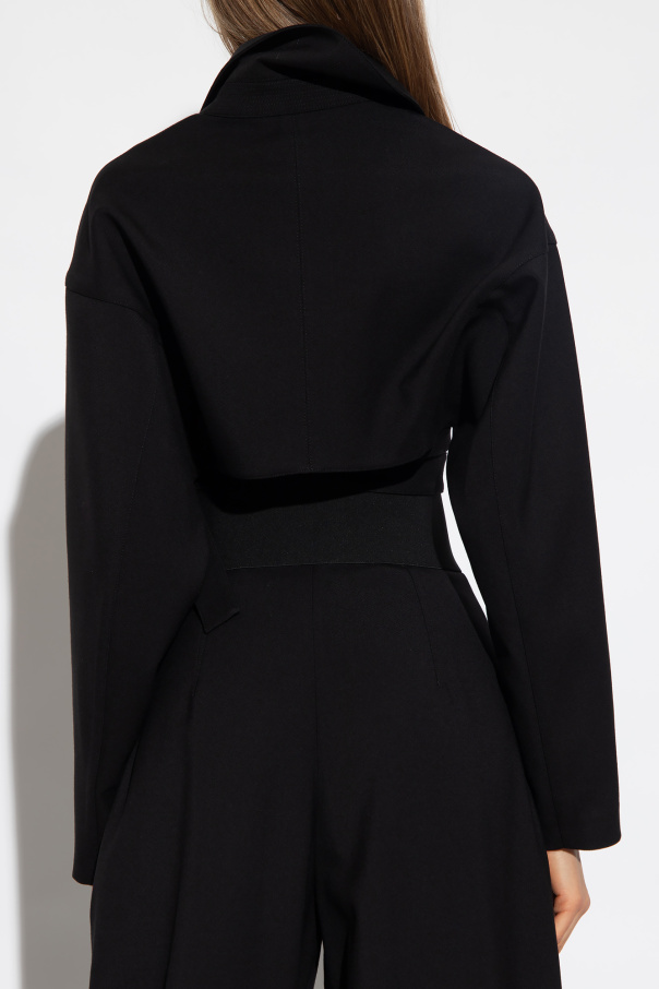 Black cropped shirt from Alaia. Made of virgin wool, this design features an adjustable buckled waist belt, notch lapels and long sleeves with low shoulders.