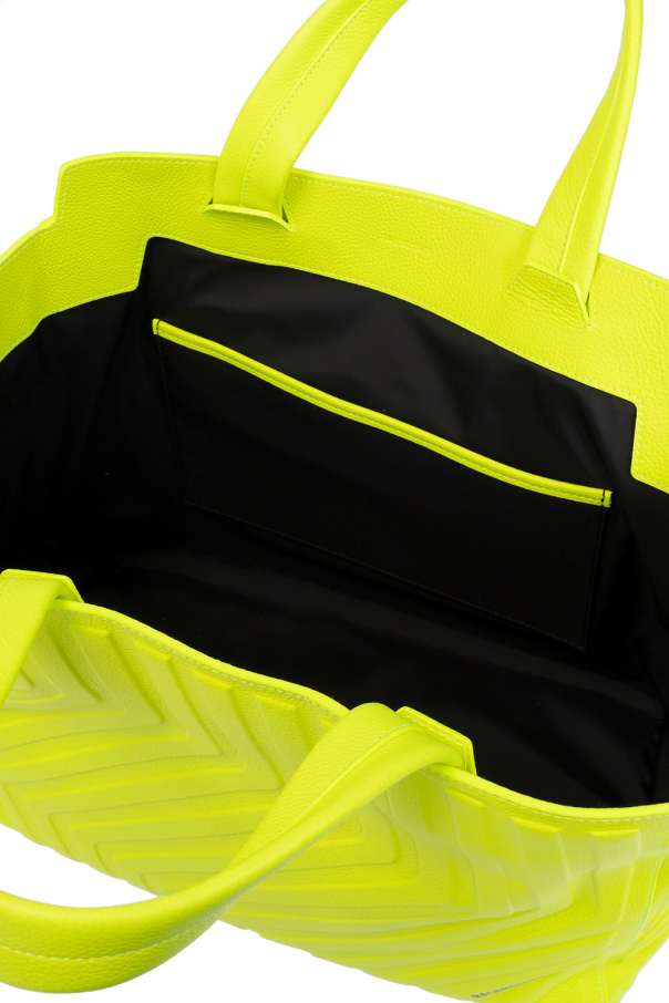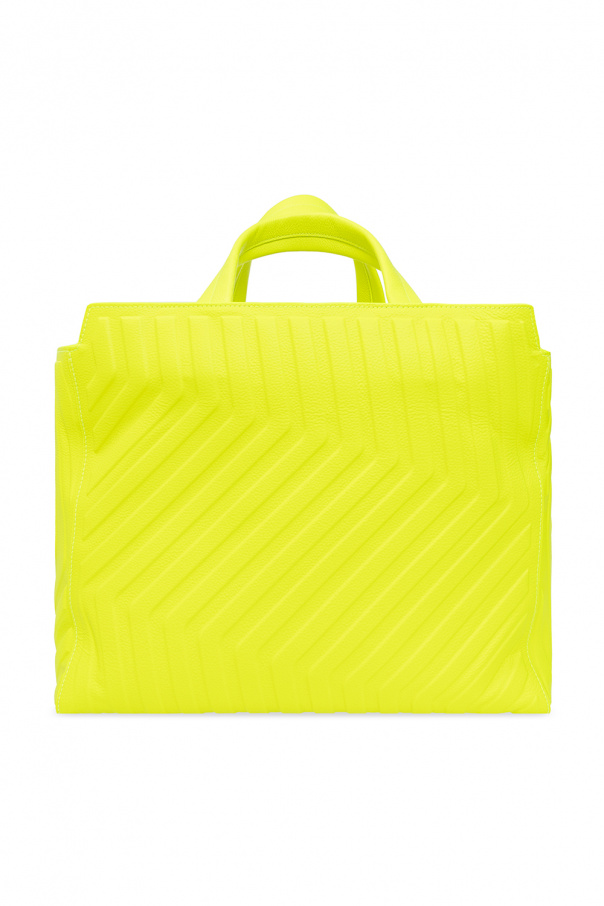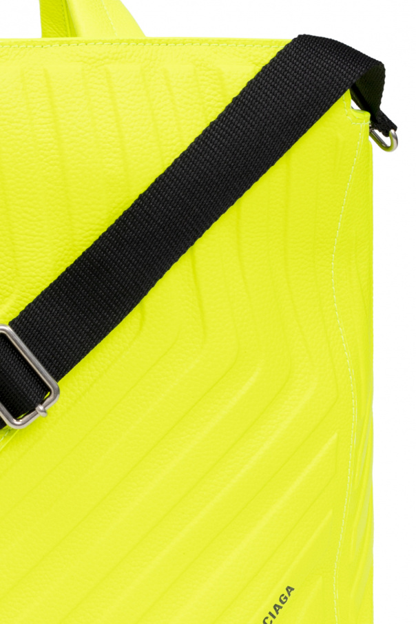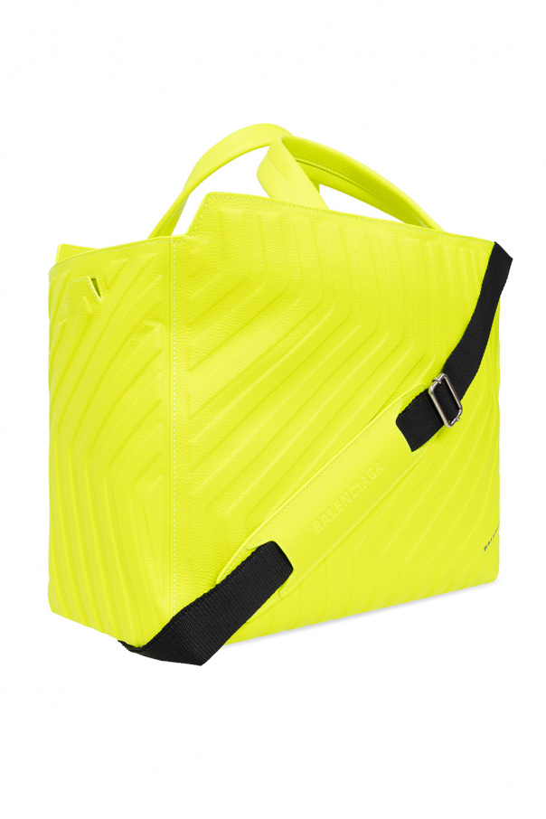 Neon green ‘Car Medium East-West’ shopper bag from Balenciaga. Crafted from grainy calf leather, this design showcases an embossed car tire pattern. It is complete with a black logo print on the front, two half-round handles, a detachable and adjustable shoulder strap, silver-tone metal hardware and one internal compartment with two slip pockets.