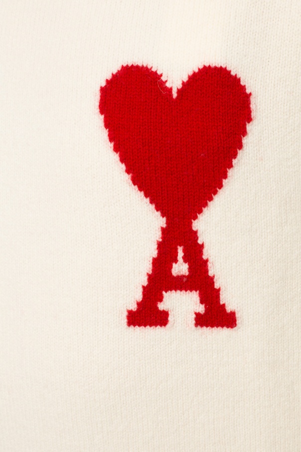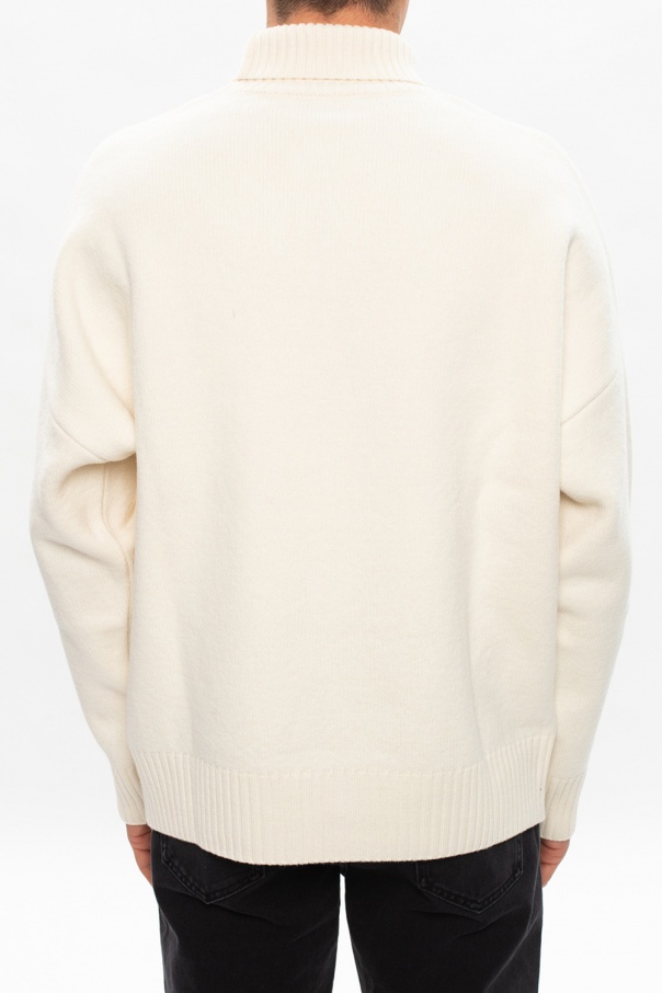 Cream roll neck sweater from Ami Alexandre Mattiussi. Knitted from wool, this jumper showcases an embroidered red logo for the designer recognition. It is complete with a snug turtleneck collar and ribbed finishes.