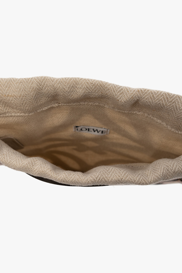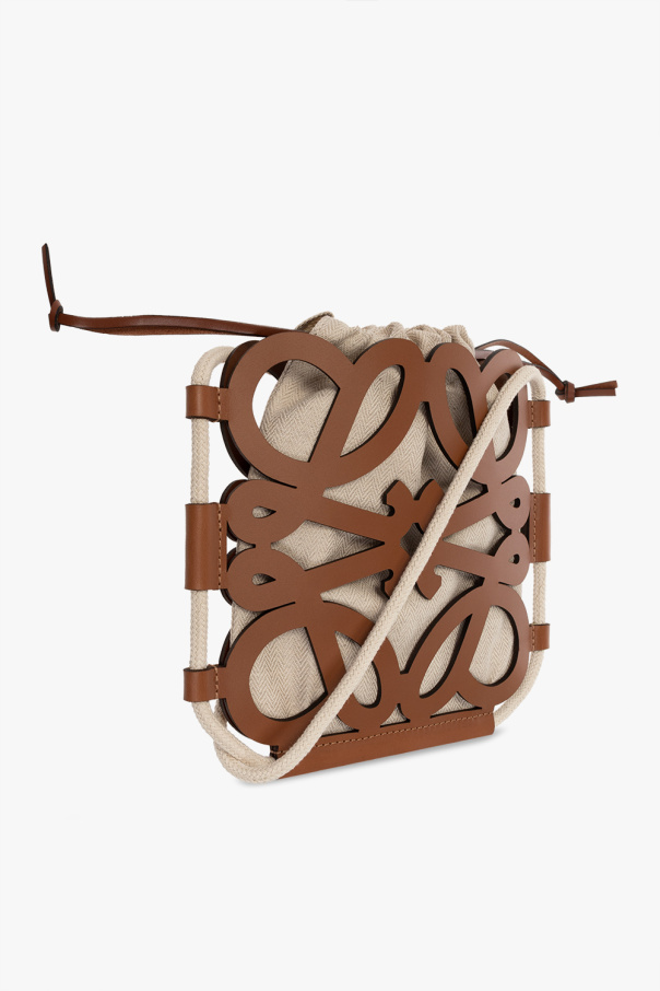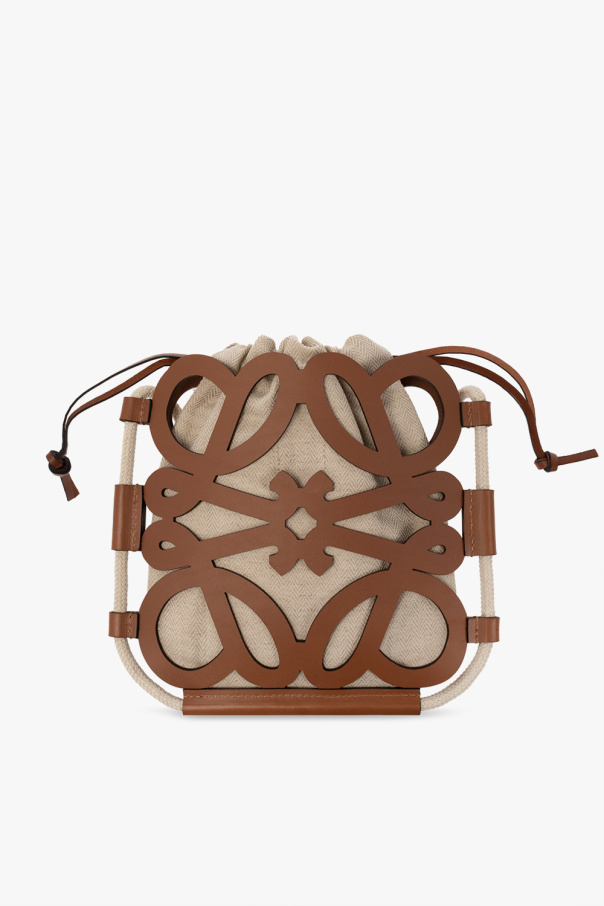 Brown and beige shoulder bag from Loewe x Paula’s Ibiza. Crafted in cut-out calf leather with openwork Anagram detailing, this design features a shoulder strap and a drawstring inner pouch in herringbone cotton canvas.