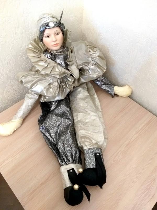 Очень необычный и редкий Арлекин . В серебрянном костюме . Голова керамика ( фарфор ) расписана в ручную . Очень красивое лицо . Фарфор на ощупь очень приятный . Тело , руки , ноги - мягконабивное . Можно украсить интерьер , также в коллекцию . Стан нормальный , в некоторых местах возможна рестоврация . Например сшить рукавички . Арлекина можно подвесить или посадить . Тяжёлый . Высота 100 см . Высокий . Купился в Канаде . Состояние как для винтажа - хорошее .