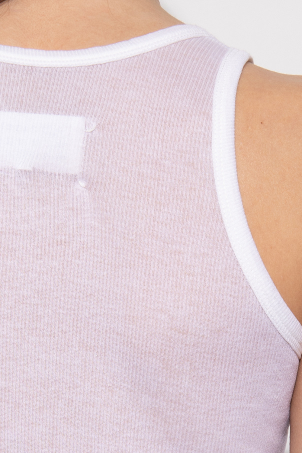 White ribbed top from Maison Margiela. Made of a cotton and silk blend, this design features a logo patch and ribbed crew neck.