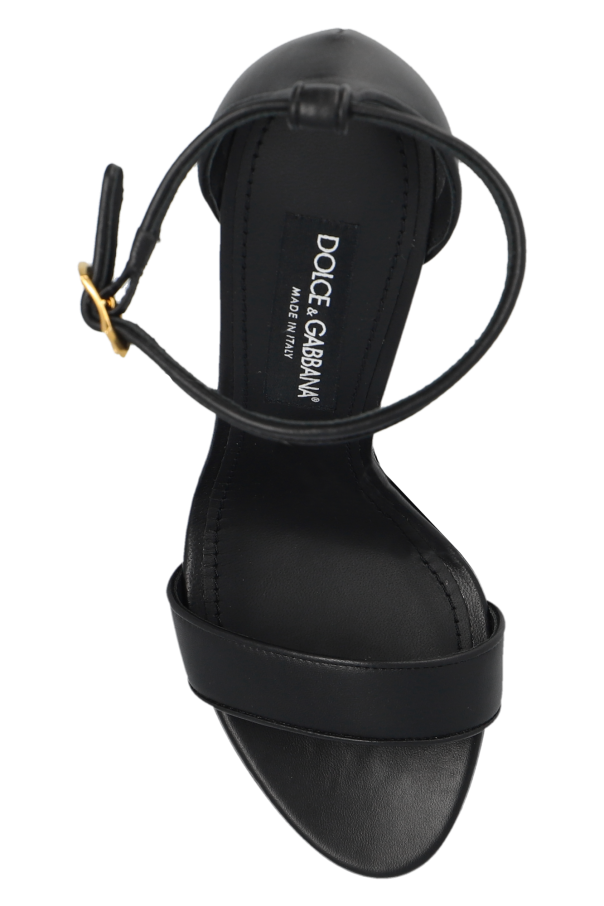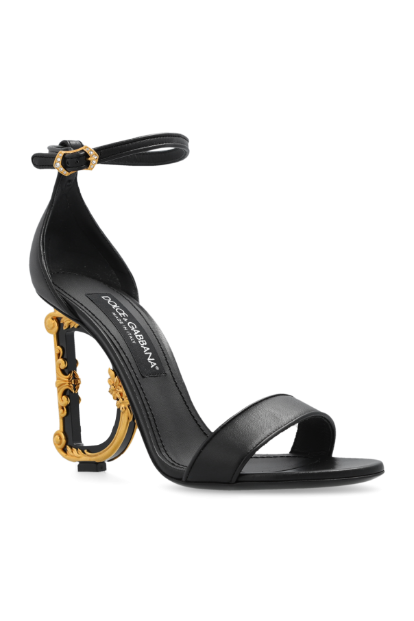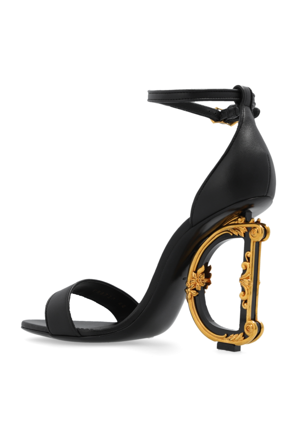 Black ‘Keria’ sandals from Dolce & Gabbana. Made of leather, this model sits on a black leather sole and features an ankle strap and a decorative gold-tone heel.