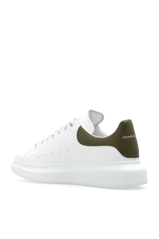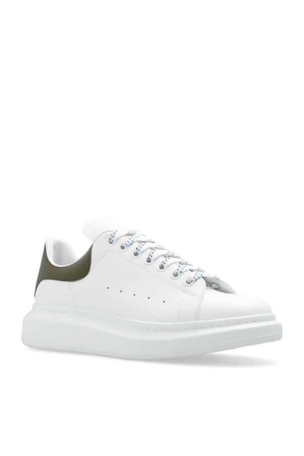White ‘Larry’ sneakers from Alexander McQueen. Made of smooth calf leather, this lace-up pair features a silver-tone logo print, patterned shoelaces, khaki heel counter and white rubber sole. Comes with swappable shoelaces.