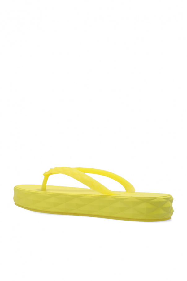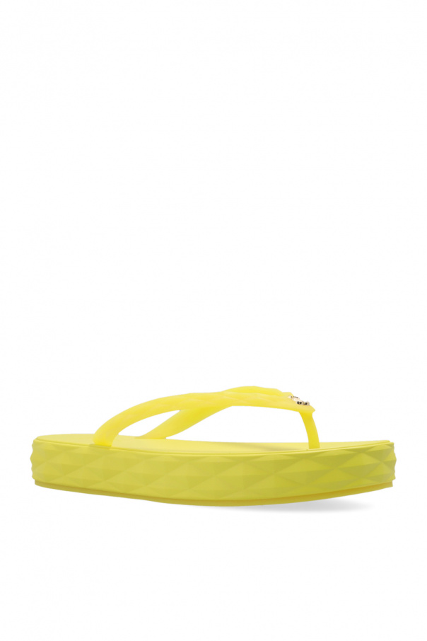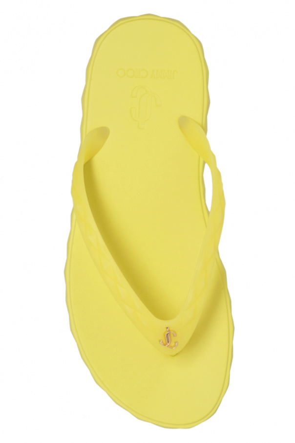 Yellow ‘Diamond’ slides from Jimmy Choo. Crafted from rubber, this pair features an embossed geometric pattern, metal logo applique in gold-tone and a yellow rubber sole.