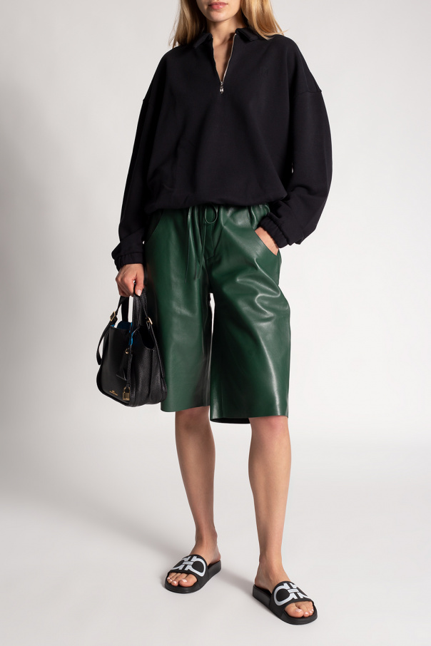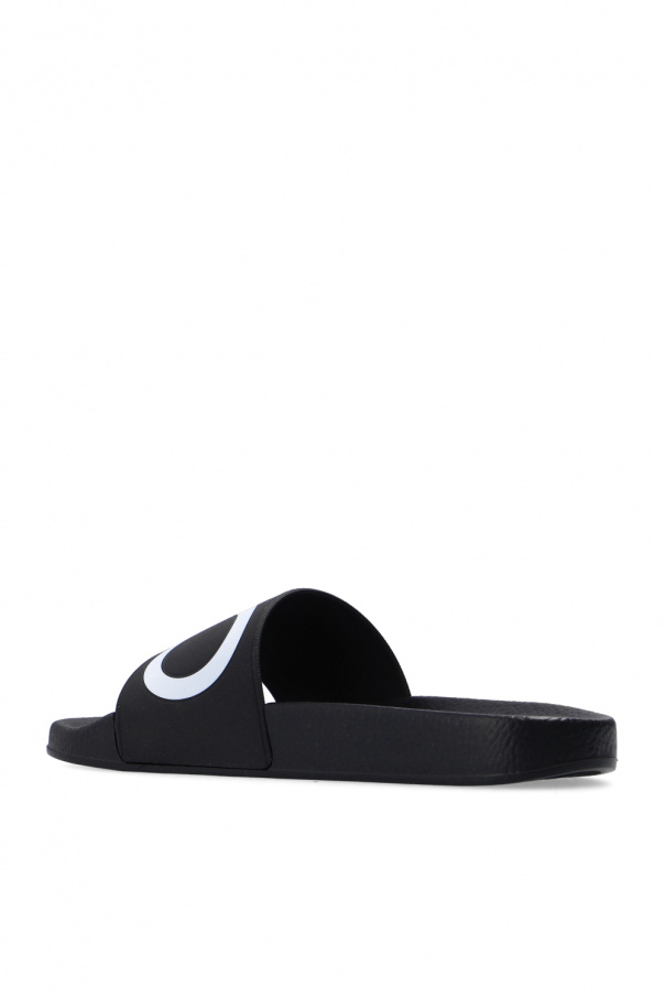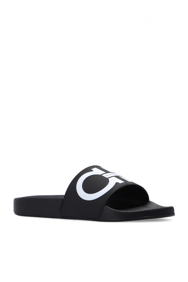 Black ‘Groovy’ slides from FERRAGAMO. Made of rubber, this design is decorated with a white logo print.