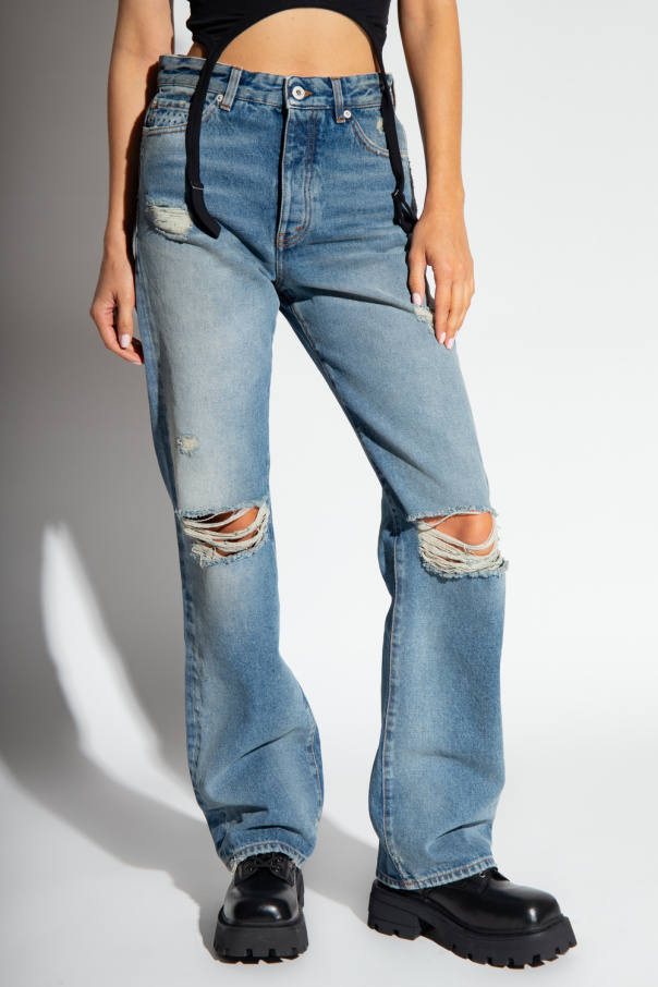 Blue and beige jeans from Heron Preston. Made of cotton, this straight leg design features button fastenings, worn effect, five slip pockets and logo patch in orange and black at the back.