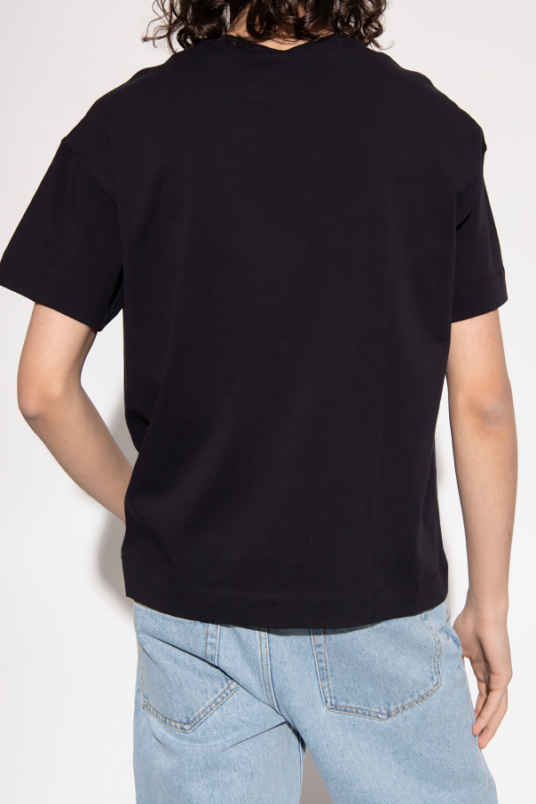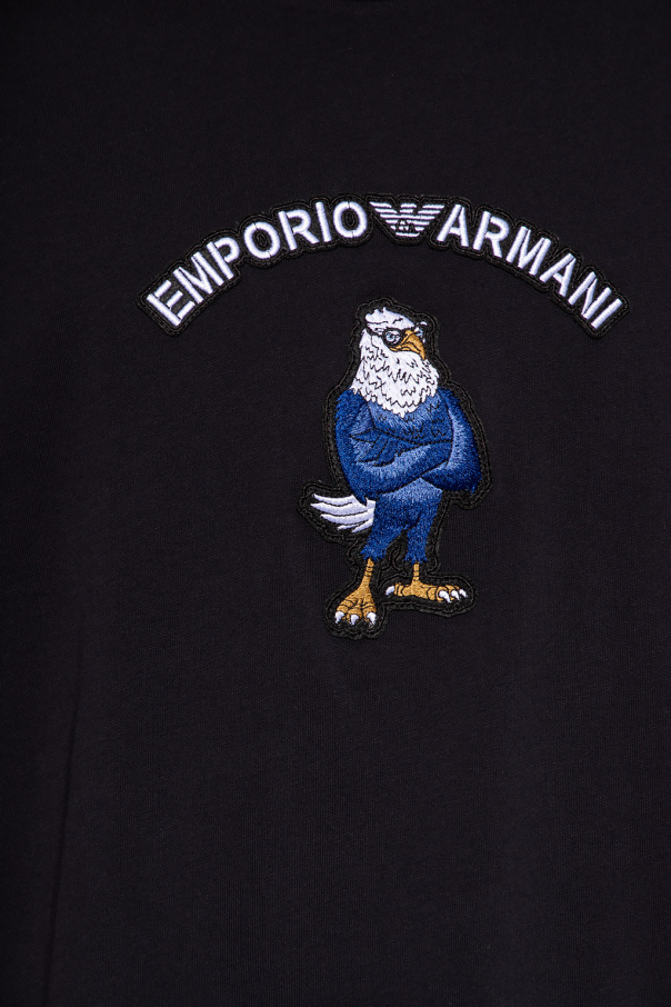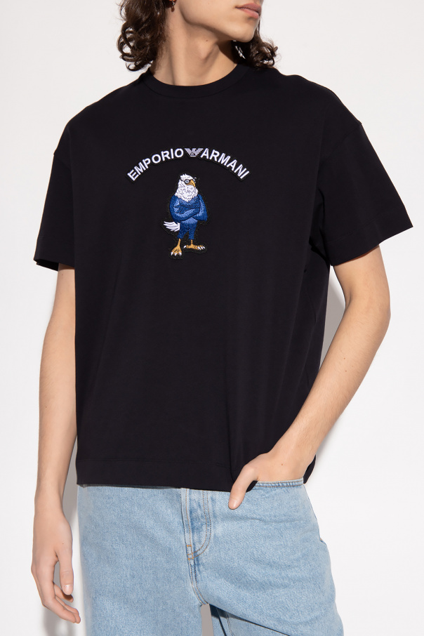 Dark navy T-shirt from Emporio Armani. Made of cotton, this short sleeve design features a ribbed crew neck and multicolored patch with an animal motif and logo detail.