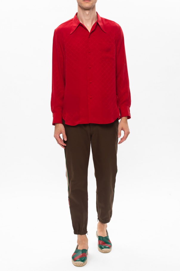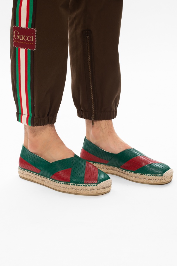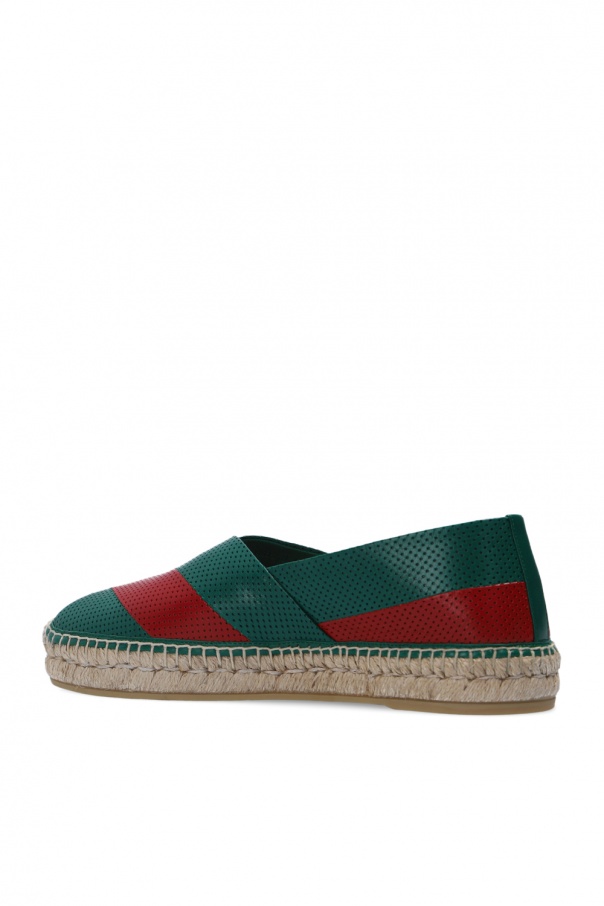 Green and red ‘Malaga Kid’ espadrilles from Gucci. Crafted from leather, this pair features a decorative stripe pattern and white rubber sole with woven details.