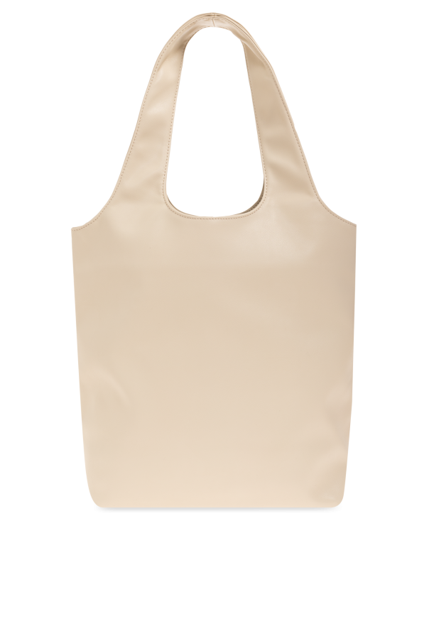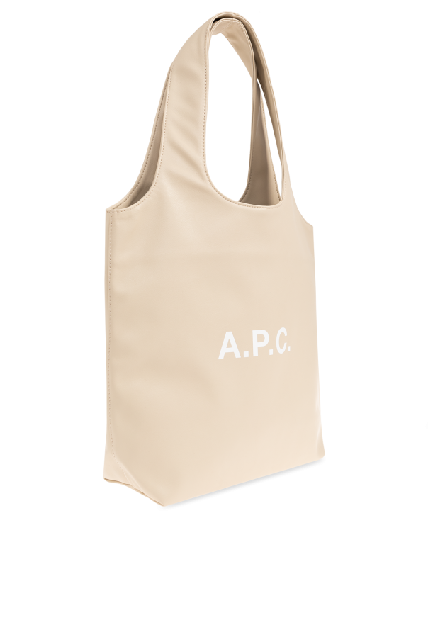 Light beige ‘Ninion Small’ shopper bag from A.P.C. This model features a white logo, two half-round handles and one internal compartment with one slip pocket.