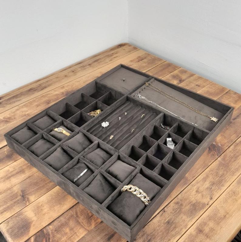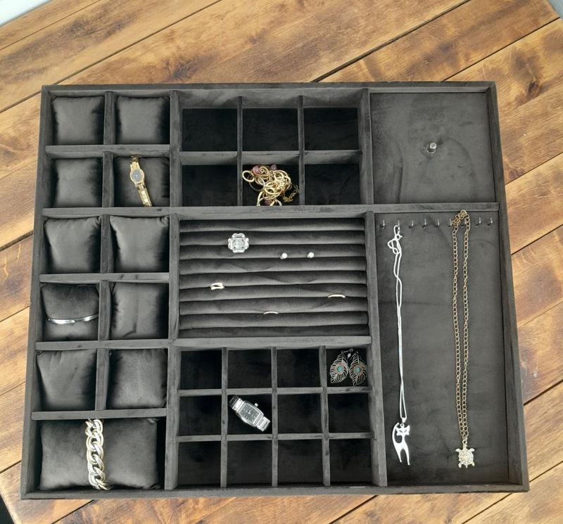 Модуль-вкладыш для украшений в ящик, коричневый 535*470*50мм Wooden Organizer предназначен для хранения украшений, часов и других аксессуаров. Вмещает в себя следующие ячейки для хранения: