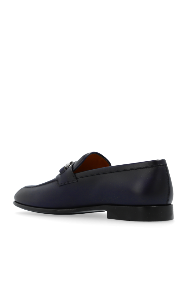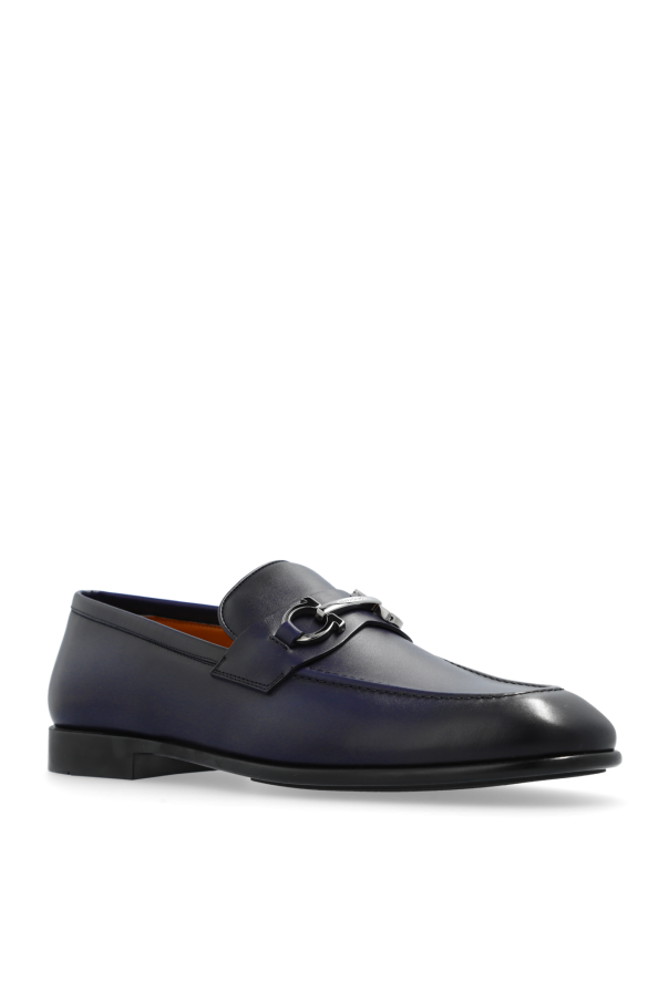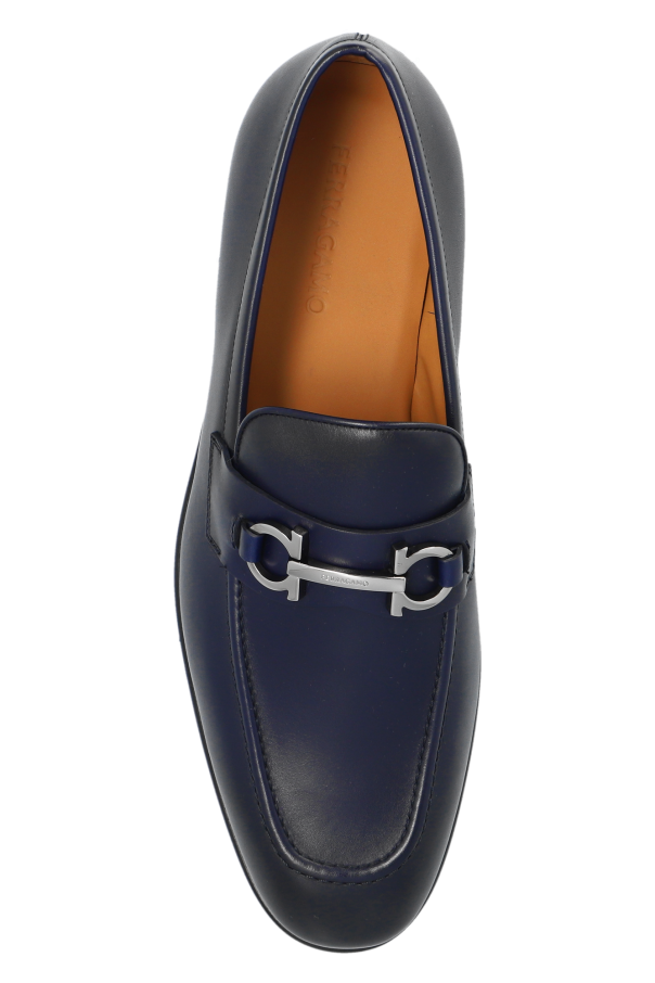 Introducing the \'Foster\' Loafers by FERRAGAMO - a testament to the fusion of traditional elegance and contemporary craftsmanship. These loafers, distinguished by their deep navy hue, are an essential addition to the discerning gentleman\'s wardrobe. Crafted from the finest calfskin leather, the \'Foster\' loafers feature a smooth, subtly gleaming upper that speaks volumes of the quality invested in their creation. The incorporation of a sleek, silver buckle atop brings a touch of sophistication, making these shoes versatile enough to complement both formal attire and casual ensembles. The rounded toe maintains the classic loafer silhouette, while the rubber sole ensures durability and comfort, promising an unwavering grace with every step. The interior, adorned in a light brown leather, illustrates an unwavering attention to detail and a commitment to luxury. Why Purchase the \'Foster\' Loafers? Exquisite Materials: 100% calfskin leather exterior and interior for unmatched quality. Refined Design: Elegant navy color paired with a silver buckle accentuates its sophisticated appeal. Versatile Style: Perfectly pairs with both formal and casual outfits, enhancing any look. Comfort & Durability: Crafted with a rubber sole for lasting wear without sacrificing comfort.