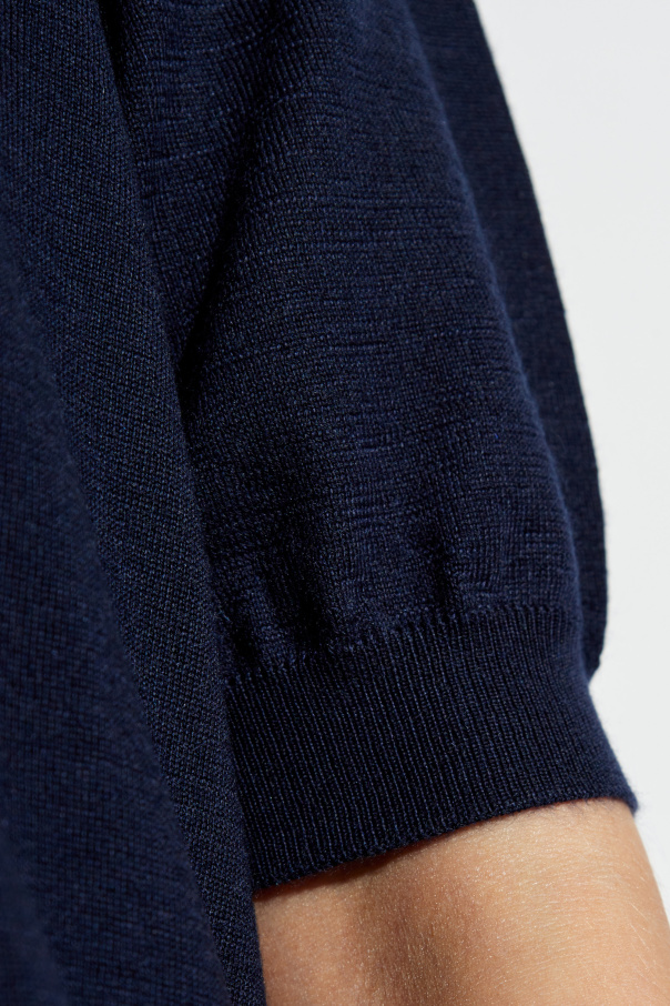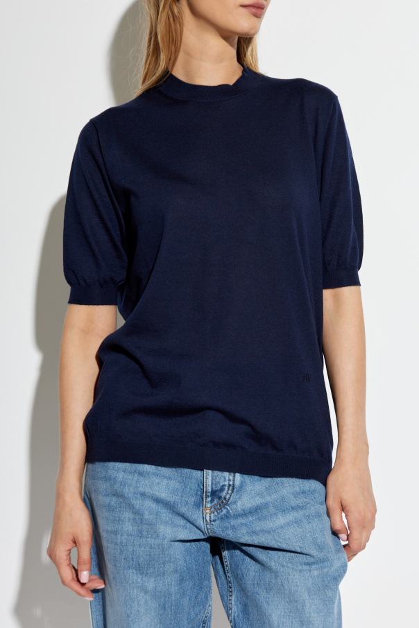 Experience the epitome of sartorial elegance with the Bottega Veneta Navy Blue Embroidered Logo Top. This exquisite garment, part of a two-piece ensemble, exudes sophistication and timeless style. Crafted from 100% luxurious cashmere, the fabric ensures unparalleled softness and comfort, boasting a delicate, uniform weave that highlights its premium quality. The top features a classic, straightforward cut with short sleeves that end just above the elbows, finished with refined ribbed cuffs for an added touch of elegance. The round neckline sits gracefully against the neck, providing a sleek and polished look. Subtly embroidered on the lower right front, the designer\'s logo discreetly asserts the garment\'s exclusivity without overpowering its minimalist charm. Both the ribbed cuffs and hem are meticulously finished, ensuring durability and a polished appearance. The rich navy blue hue of the top is both sophisticated and versatile, making it a perfect addition to any wardrobe. Whether paired with light, relaxed jeans and a black belt for a casual yet chic ensemble or styled with other pieces from your collection, this top promises to elevate your look effortlessly. Why Choose This Product? Classic and elegant design suitable for various occasions. Crafted from 100% high-quality cashmere for exceptional comfort. Subtle embroidered logo for a touch of exclusivity. Durable ribbed cuffs and hem for a polished look. Rich navy blue color that complements any style.